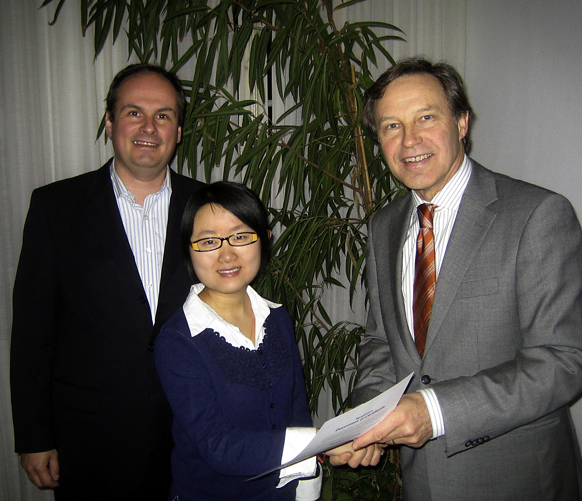 Dr. Thomas Lüttenberg (International Office), Preisträgerin Xiao Hua und Kanzler Hans-Jürgen Simm (v.l.)