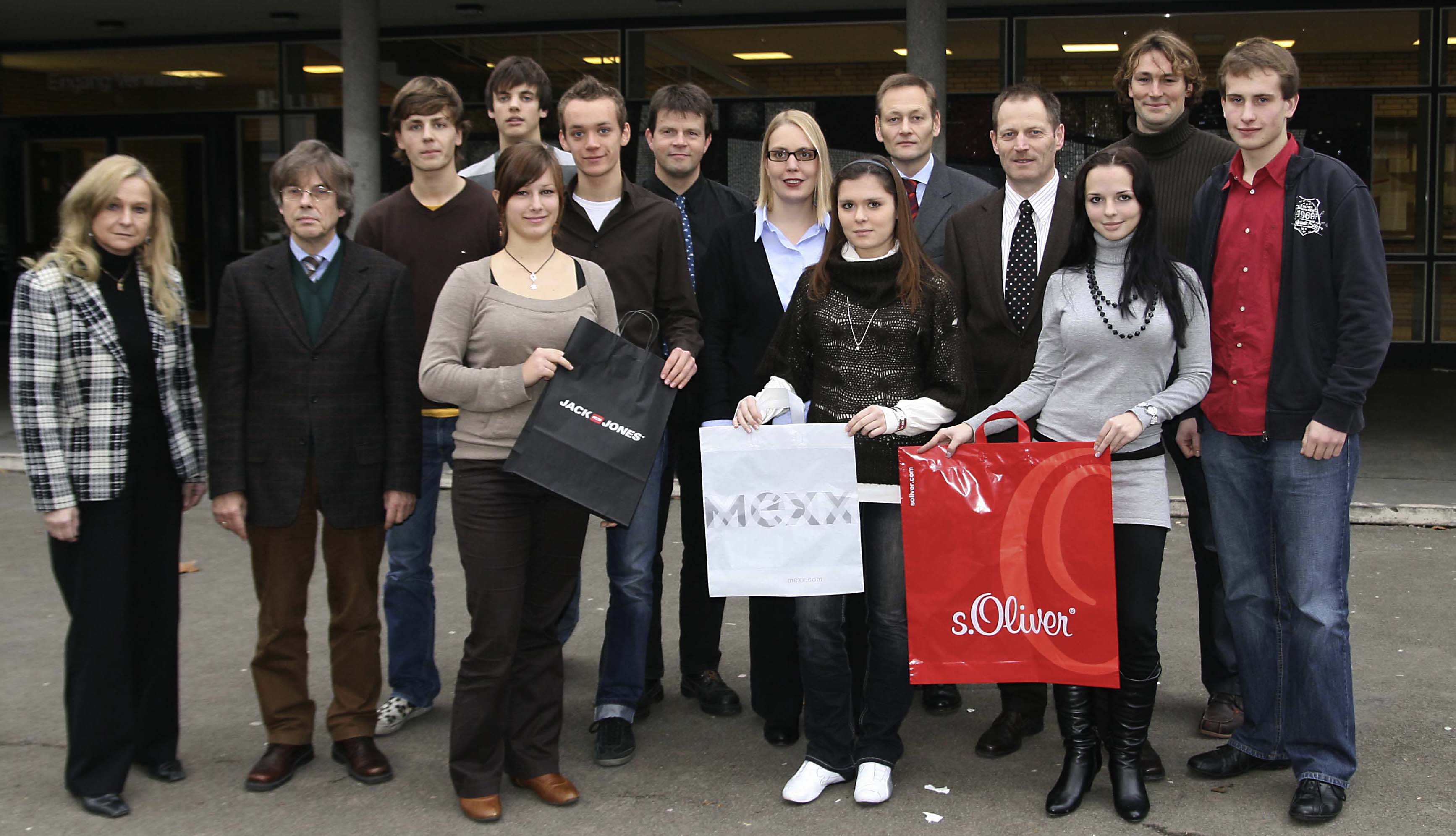 Das Foto zeigt: Schulleiterin Antje Solty (Einstein-Gymnasium Rheda-Wiedenbrück), Schulleiter Dr. Siegfried Bethlehem (Städtisches Gymnasium Gütersloh), Fabian Leisle (Städtisches Gymnasium Gütersloh), Tobias Altehülshorst (Städtisches Gymnasium Gütersloh), Janine Riedel (Friedrich-List-Berufskolleg Herford), Niklas Wichmann (Städtisches Gymnasium Gütersloh), Bernd Wolter (Friedrich-List-Berufskolleg Herford), Lea Panagopoulos-Boje (Friedrich-List-Berufskolleg Herford), Valeria Schramm (Einstein-Gymnasium Rheda-Wiedenbrück), Professor Dr. Hermann Jahnke (Universität Bielefeld), Professor Dr. Reinhold Decker (Universität Bielefeld), Matthias Homburg (Einstein-Gymnasium Rheda-Wiedenbrück), Anastasia Volodin (Einstein-Gymnasium Rheda-Wiedenbrück) und Lukas Rehaag (Friedrich-List-Berufskolleg Herford).