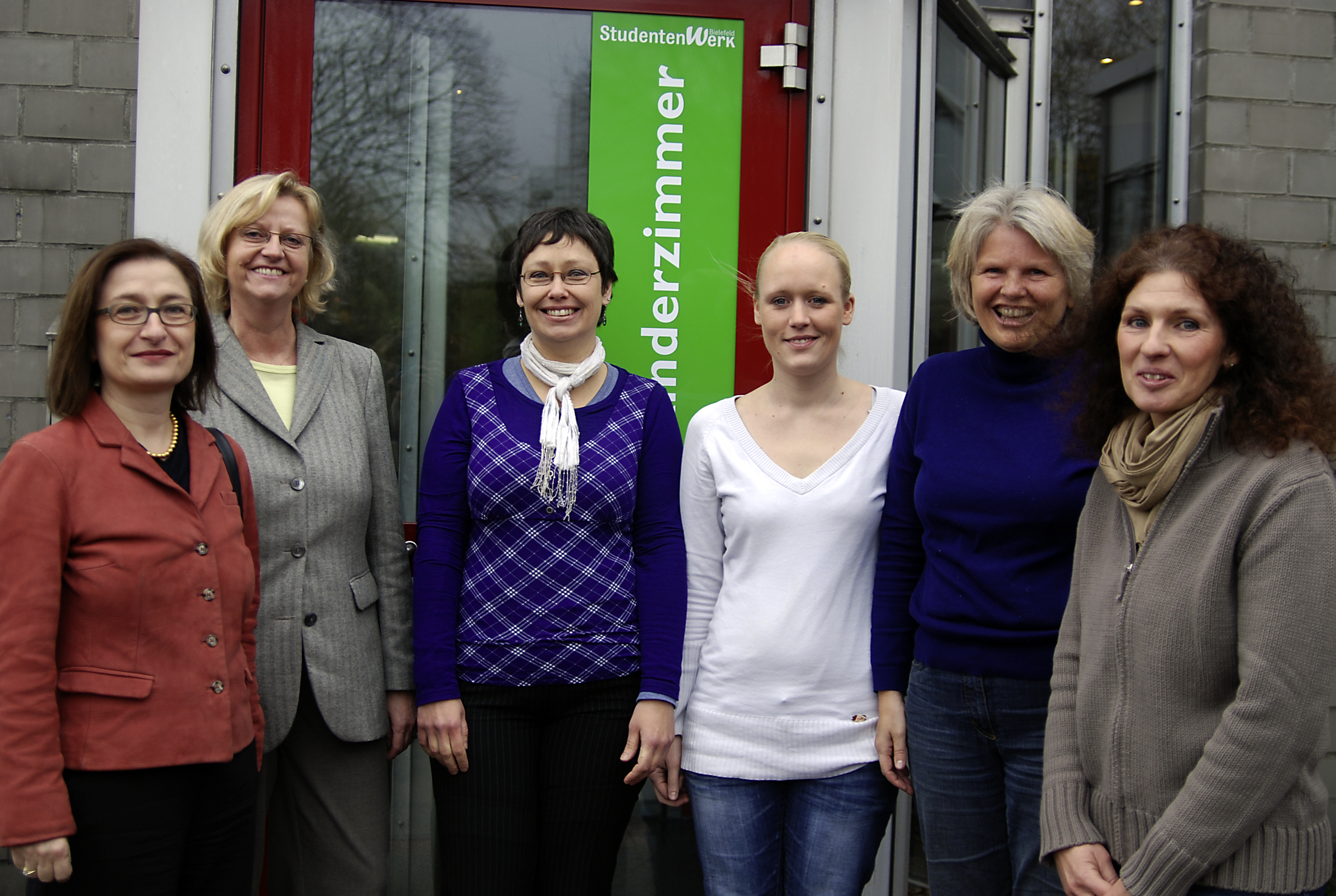 Prorektorin Professorin Dr. Joanna Pfaff-Czarnecka, Sigrid Schreiber (stellvertretende Geschäftsführerin Studentenwerk), und die Erzieherinnen im "Kinderzimmer" Simone Gursch, Romina Norbert (Leitung), Sabine Merz-Holtkamp und Hedda Dücker (v.l.)