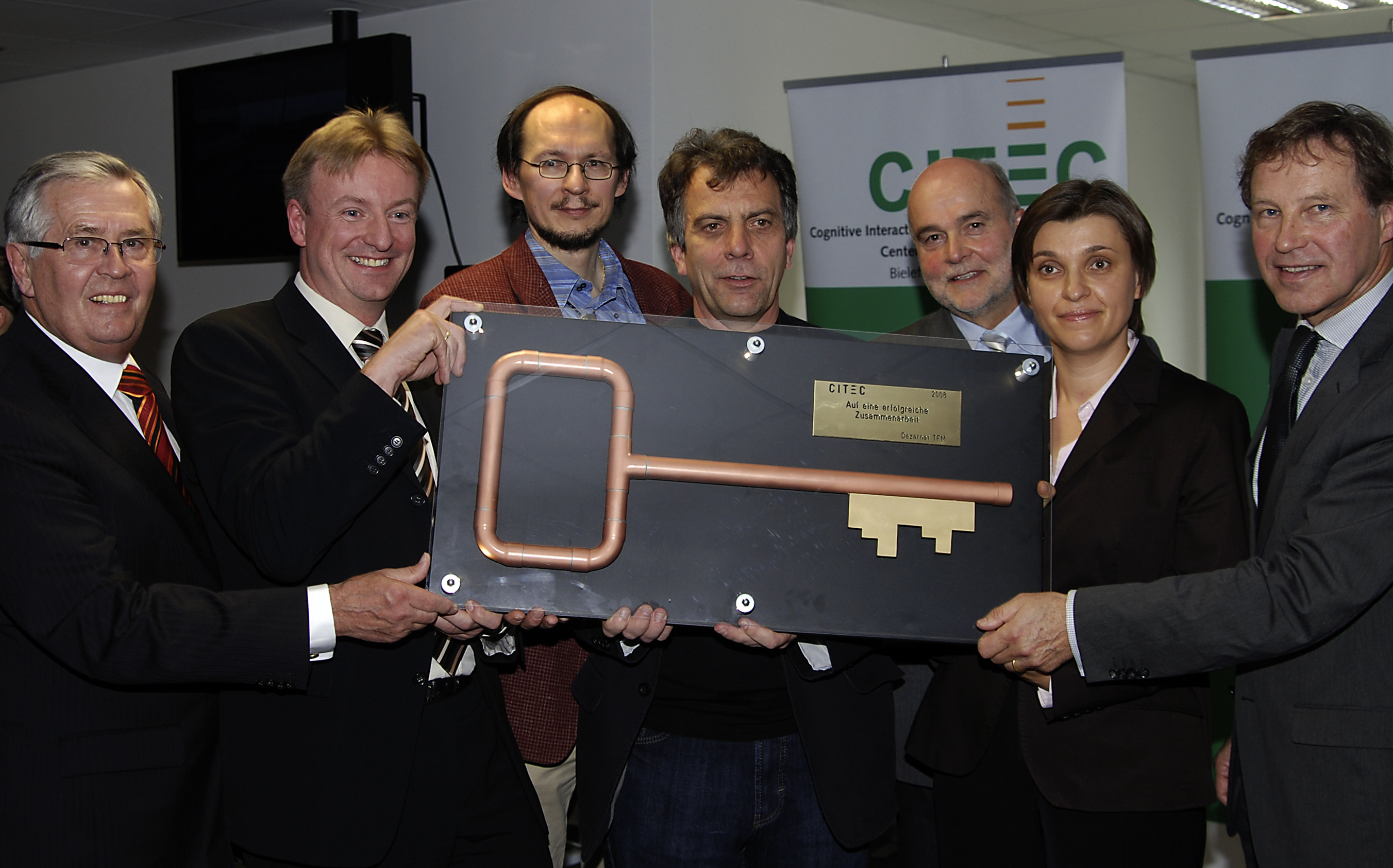 Schlüsselübergabe für das CITEC-Gebäude (v.l.): Oberbürgermeister Eberhard David, Dr. Christian Schepers, Prof. Dr. Helge Ritter, Prof. Dr. Gerhard Sagerer, Rektor Prof. Dr. Dieter Timmermann, Anita Adamczyk und Kanzler Hans-Jürgen Simm.