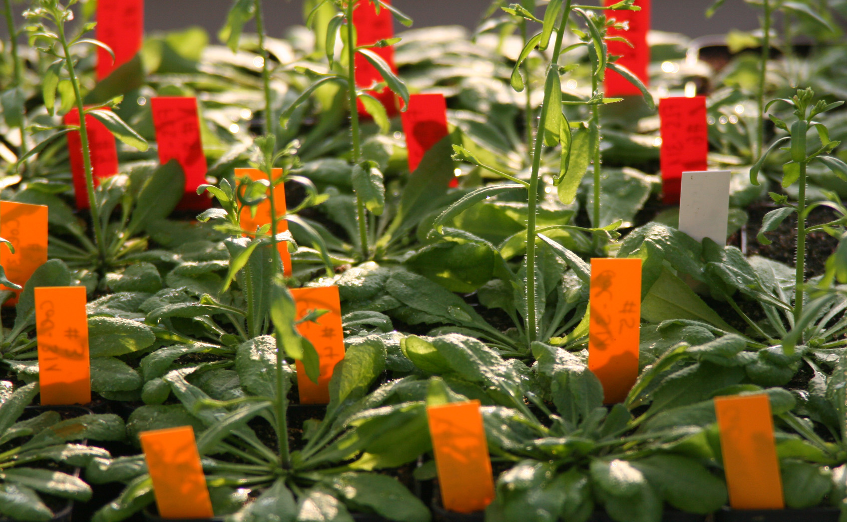 Mit Kärtchen gekennzeichnete Ackerschmalwand-Pflanzen, wie sie in großer Zahl in vielen Forschungslaboren auf der Welt in Wachstumskammern angezogen werden.
