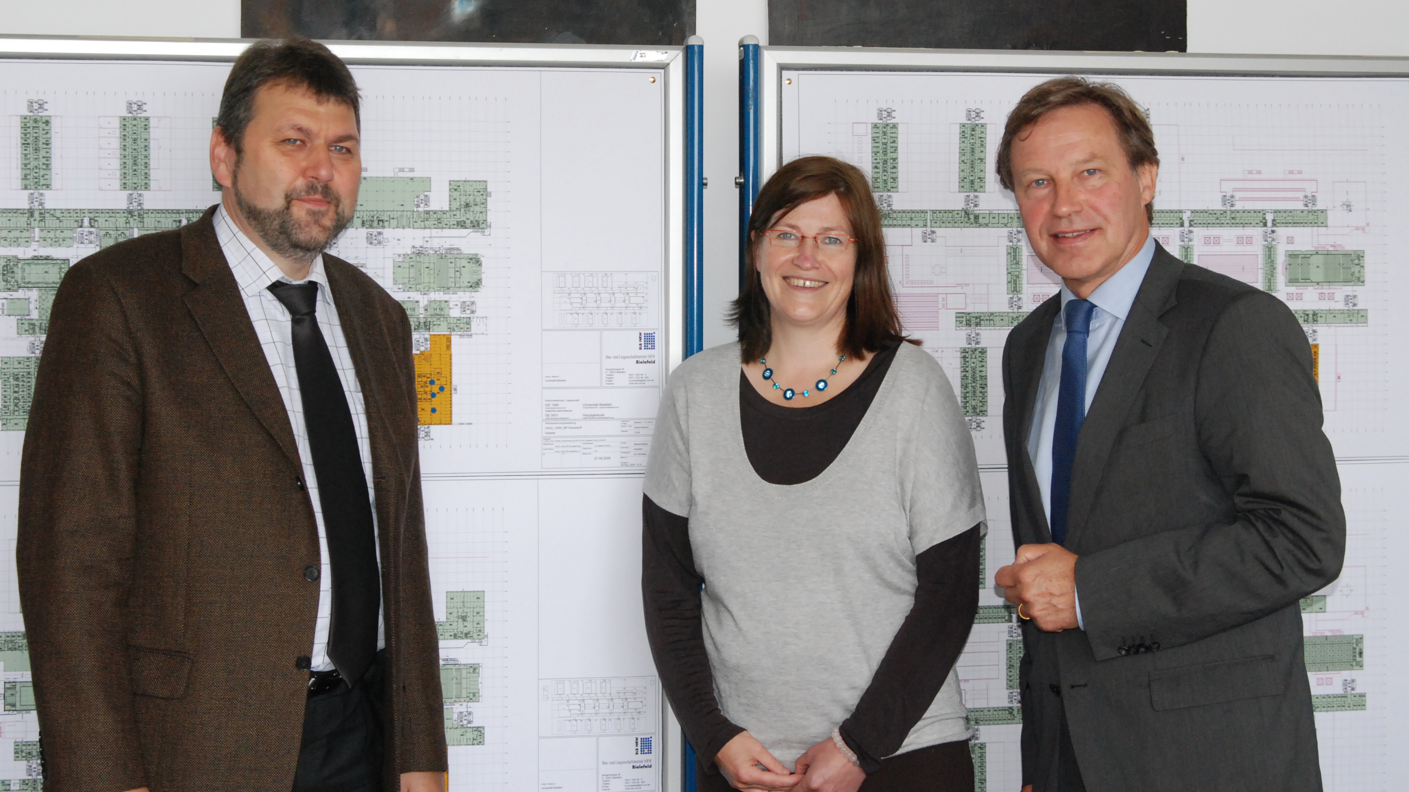 Abschluss der Asbest-Untersuchung: Reinhold Peter (stellv. BLB-Niederlassungsleiter), Gutachterin Nicole Richardson und Kanzler Hans-Jürgen Simm vor den Gebäudeplänen (v. li.). Pressekonferenz am 27.08.2008