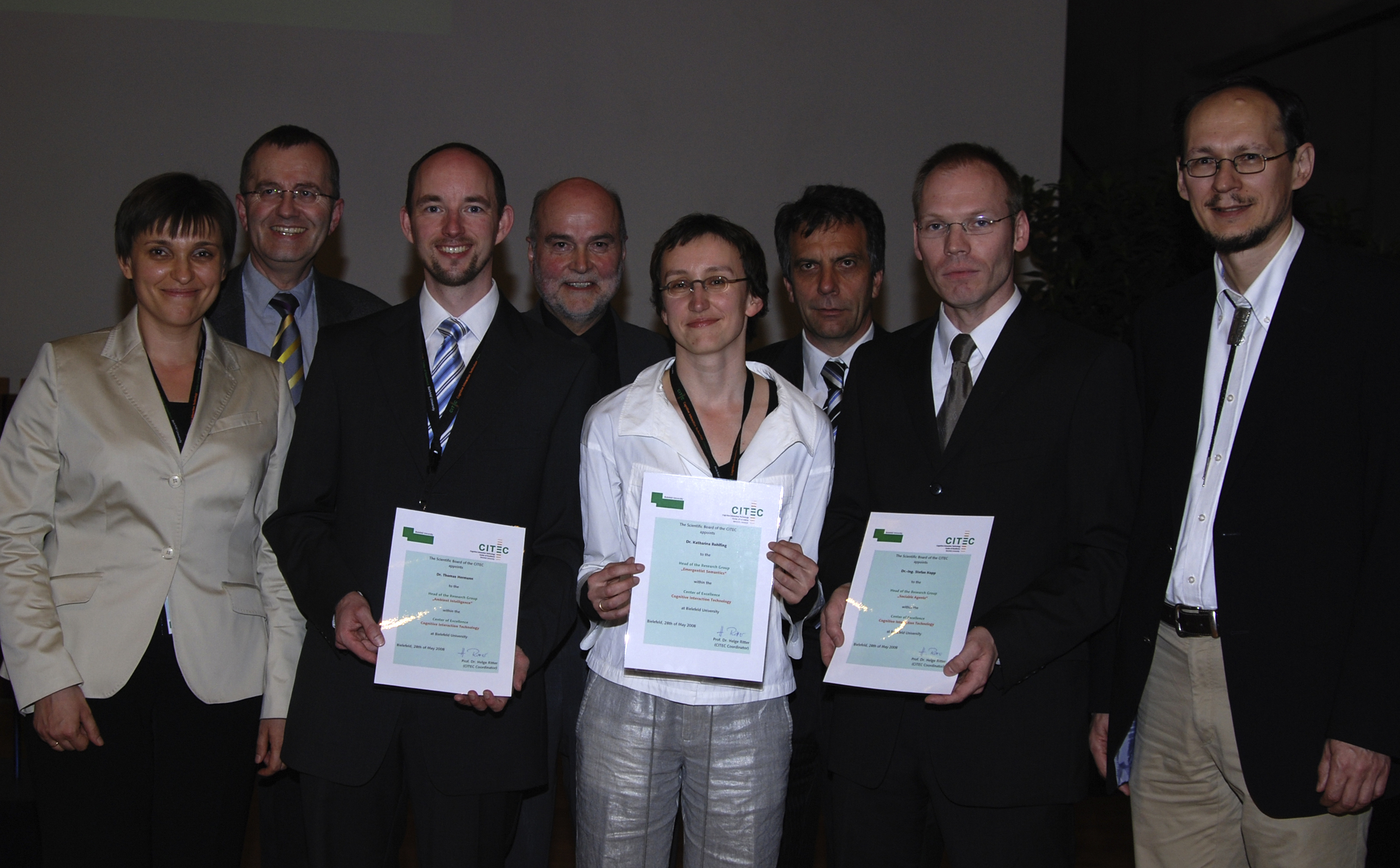 Eröffnung CITEC: CITEC-Geschäftsführerin Anita Adamczyk, Prorektor Prof. Dr. Martin Egelhaaf, Nachwuchsforscher Dr. Thomas Hermann, Rektor Prof. Dr. Dieter Timmermann, Nachwuchswissenschaftlerin Dr. Katharina Rohlfing, Prof. Dr. Gerhard Sagerer, Nachwuchswissenschaftler Dr.-Ing. Stefan Kopp und Prof. Dr. Helge Ritter (v.l.)