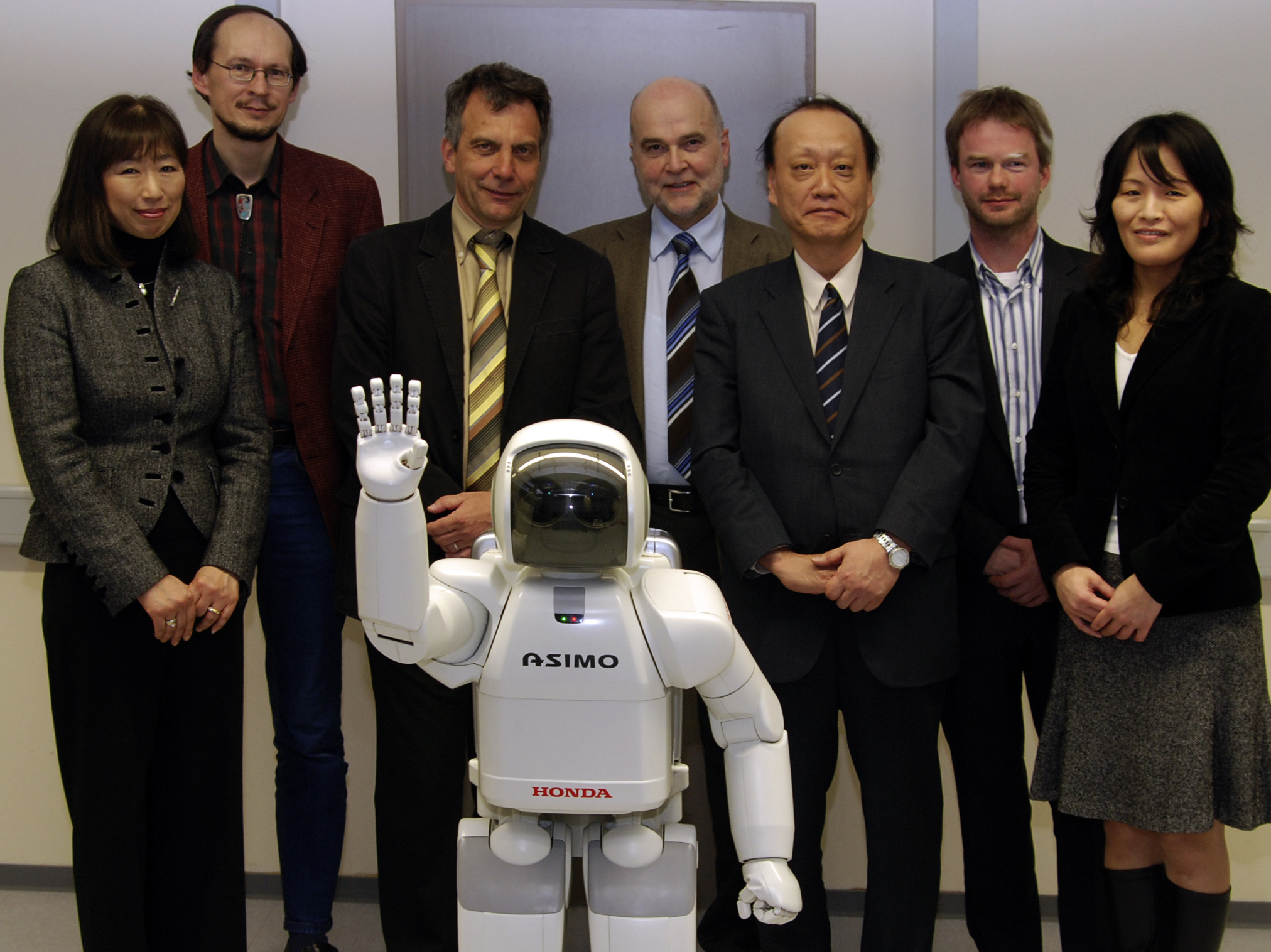 Mami Busse ( Vizepräsidentin der Deutsch-Japanischen Gesellschaft), die Professoren Helge Ritter und Gerhard Sagerer (Technische Fakultät), Rektor Professor Dr. Dieter Timmermann, Generalkonsul Shin Maruo, Dr. Jochen Steil (Geschäftsführer CoR-Lab) und Yukie Nagai (Technische Fakultät) mit Asimo (v.l.).