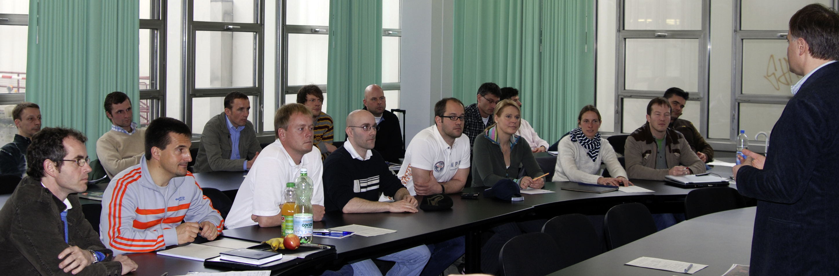 Prof. Dr. Thomas Schack (Arbeitsbereich Neurokognition und Bewegung - Biomechanik) referiert vor (v.l.) Jan-Erik Aeply (Sportschießen), Georg Hackl (Rodeln), Hans-Christian Beckmann (Golf), Axel Schulze (Turnen), Steffen Wöller (Rodeln), Gunda Niemann-Stirnemann (Eisschnelllauf), Kathrin Röhner (Segeln), Alexander Leipold (Ringen) und dahinter Toni Liebezeit (Short Track), Phillip Hess (Reiten), Markus Scharmann (Reiten), Dany Leger (Eisschnelllauf) und Uwe Kinkel (Golf).