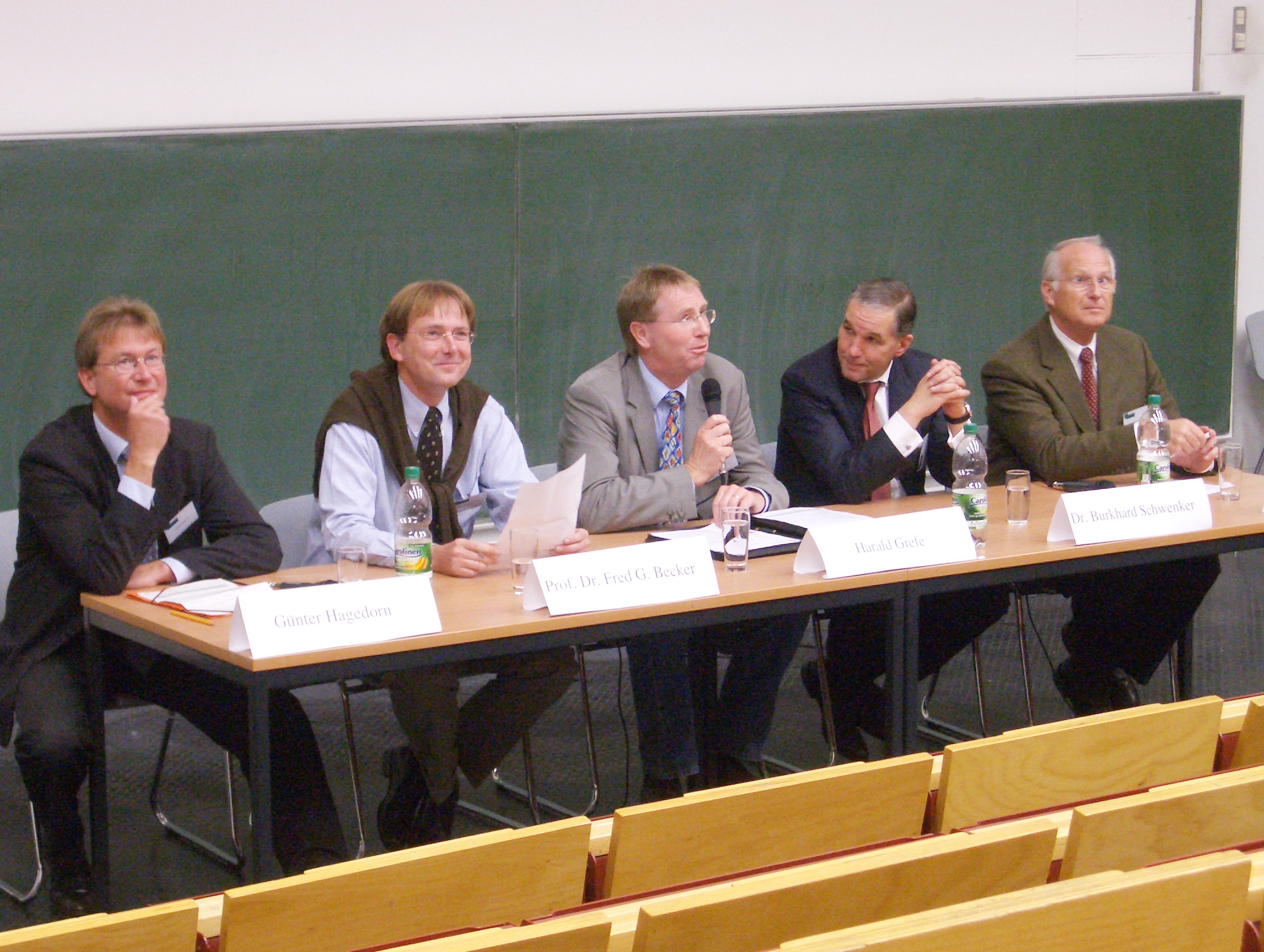 Alumni-Tag der Fakultät für Wirtschaftswissenschaften: Günter Hagedorn, Professor Dr. Fred G. Becker, Harald Grefe, Dr. Burkhard Schwenker und Professor Dr. Joachim Frohn nahmen an der Podiumsdiskussion teil.