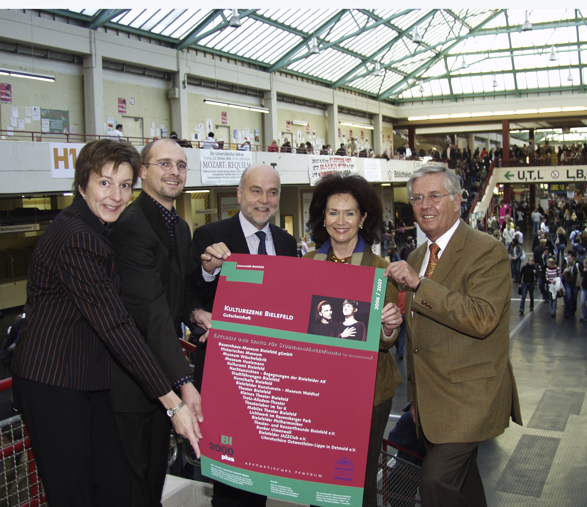 Kulturschecks für Studierende. Dr. Heike Piehler (Ästhetisches Zentrum), Carl Peter Kleidat (Bielefeld 2000plus), Rektor Prof. Dr. Dieter Timmermann, Christiane Pfitzner (Theater- und Konzertfreunde) und Oberbürgermeister Ebehard David (v.l.).