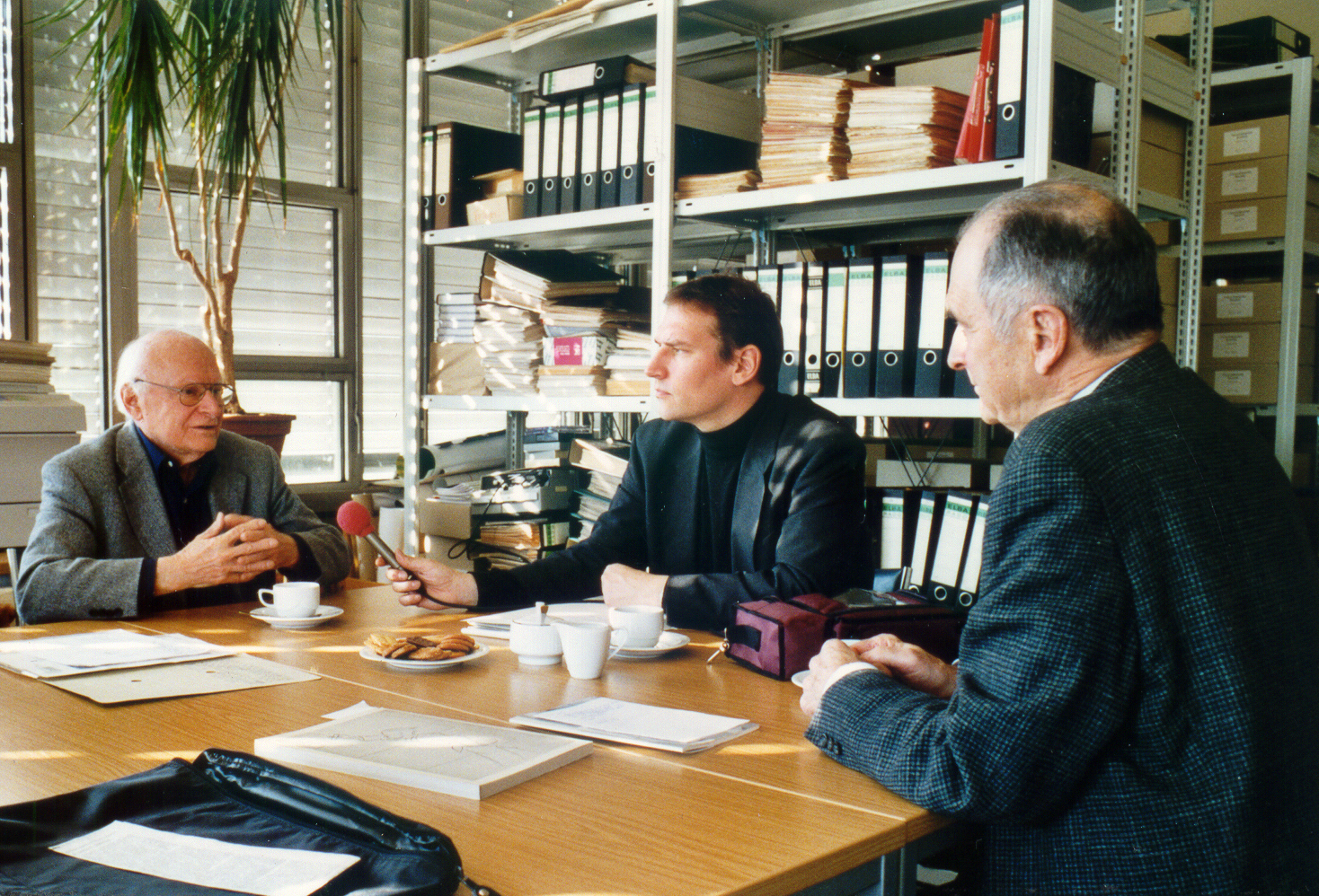 Interview mit Prof. Dr. Reinhart Koselleck (l.), zu Norbert Elias im Universitätsarchiv, mit Archivar Martin Löning (m.) und Universitätskanzler a. D. Dr. Eberhard Firnhaber.