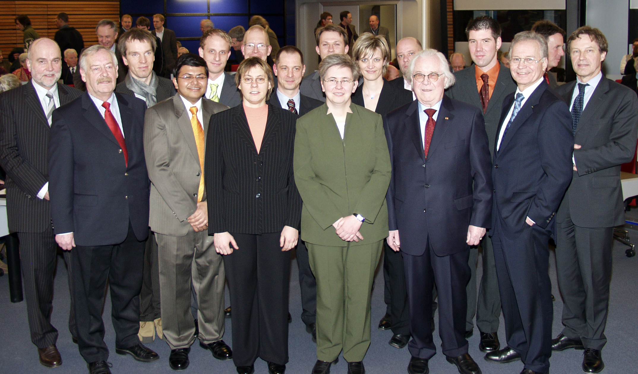 Dissertationspreisvergabe der Universitätsgesellschaft. Das Foto zeigt v.l.: Rektor Dieter Timmermann, Bürgermeister Horst Grube, Dr. Fabian Kessl, Dr. Soumyajit Roy, Dr. Sven Kämmerer, Dr. Christian Jostmann, Dr. Vera Thümmler, Dr. Lars Riedl, Dr. Wolfgang Lemke, Dr. Kathrin Brei, Dr. Meike Schwabe, Dr. Christian Oestersandfort, Professor Helmut Steiner, Dr. Carsten Drepper, Ortwin Goldbeck und Kanzler Hans-Jürgen Simm.