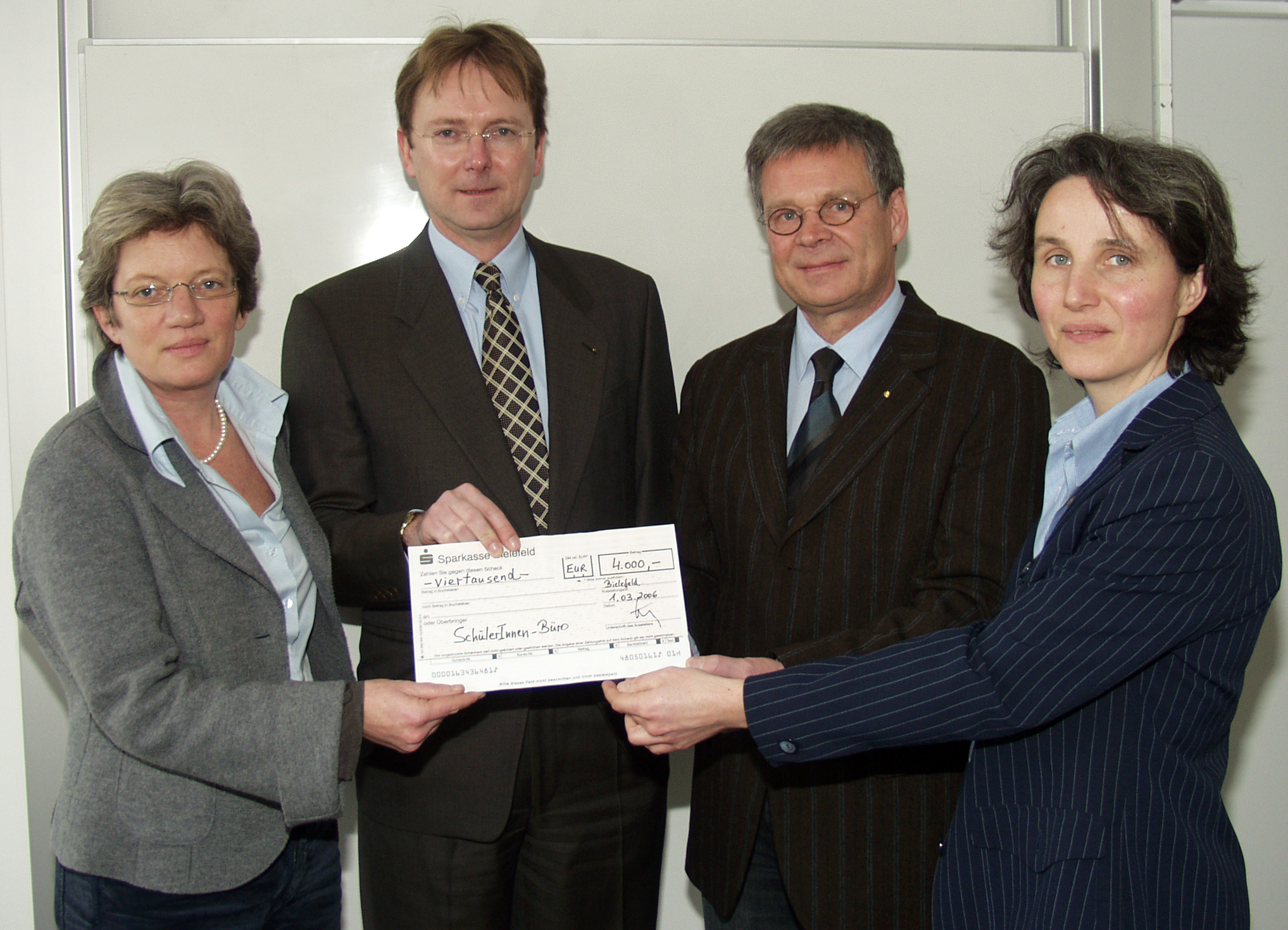 Bild: Präsident Dr. Wolf Ebmeyer (2.v.r.) und Projektbetreuer Prof. Dr. Fred Becker (2.v. l.) vom Rotary-Club Bielefeld-Süd überreichten den beiden Vertreterinnen vom SchülerInnen-Büro Dr. Andrea Frank (l.) und Anja Neumann (r.) die Spende in Höhe von 4 000 Euro. Bildnummer: 33193