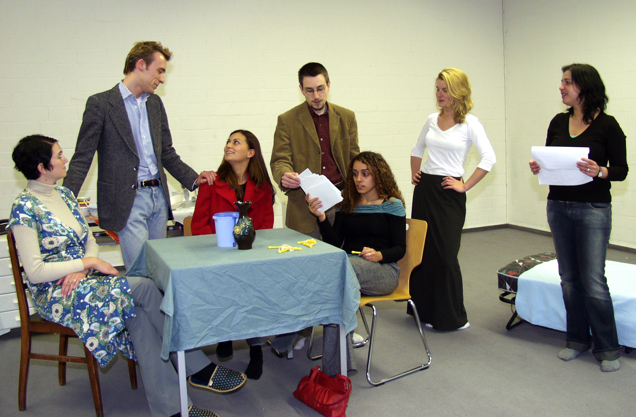 Die English Drama Group der Universität Bielefeld präsentiert das amerikanische Theaterstück "Crimes of the heart" von Beth Henley. das Probenfoto zeigt (v.l): Sabrina Köpke (Lenny Magrath), Setffen Kuth (Doc Porter), Nural Akbayir (Meg Magrath), Jesse Hicks (Barnett Loyd), Maha Salem (Babe), Catharina Cerny (Chick) sowie die Leiterin und Regisseurin Mirjam Manoutchehri.