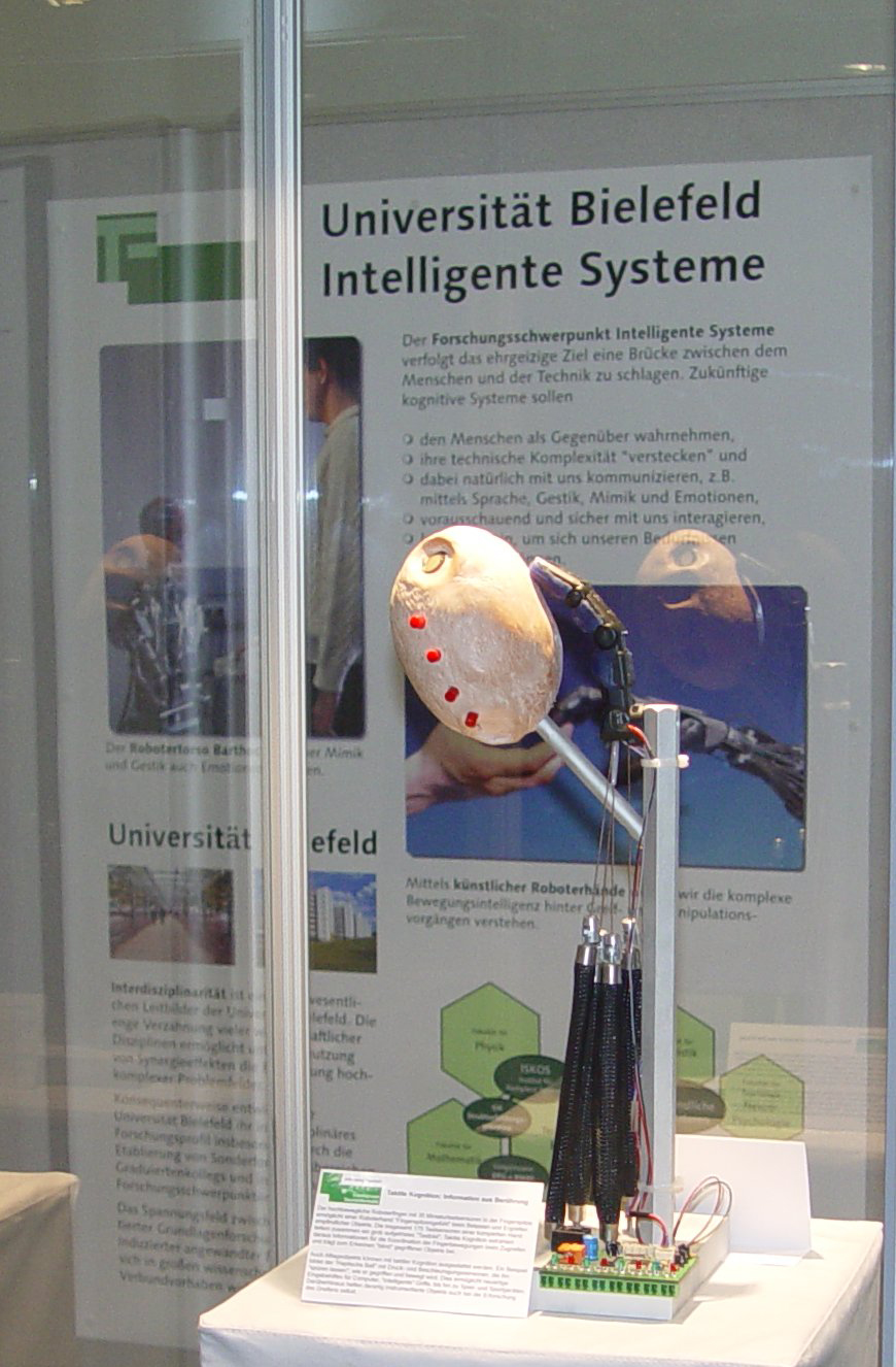 Das im Landtag ausgestellte Exponat zeigt einen Finger der fünffingrigen Bielefelder Roboterhand, die ausgestattet mit je 35 Miniaturtastsensoren pro Fingerspitze in der Lage ist auch empfindliche Objekte zu greifen