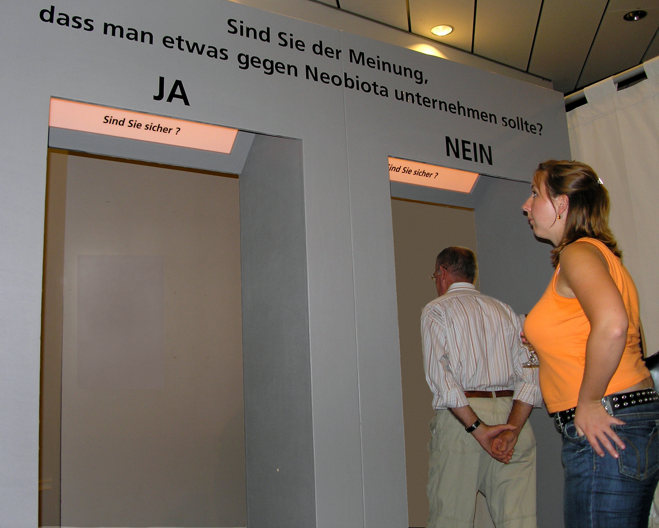 Bild: Der Ausgang zwingt der Ausstellung "Neobiota" zwingt zur Stellungnahme: Soll etwas gegen die neuen Organismen unternommen werdenBildnummer: 30552