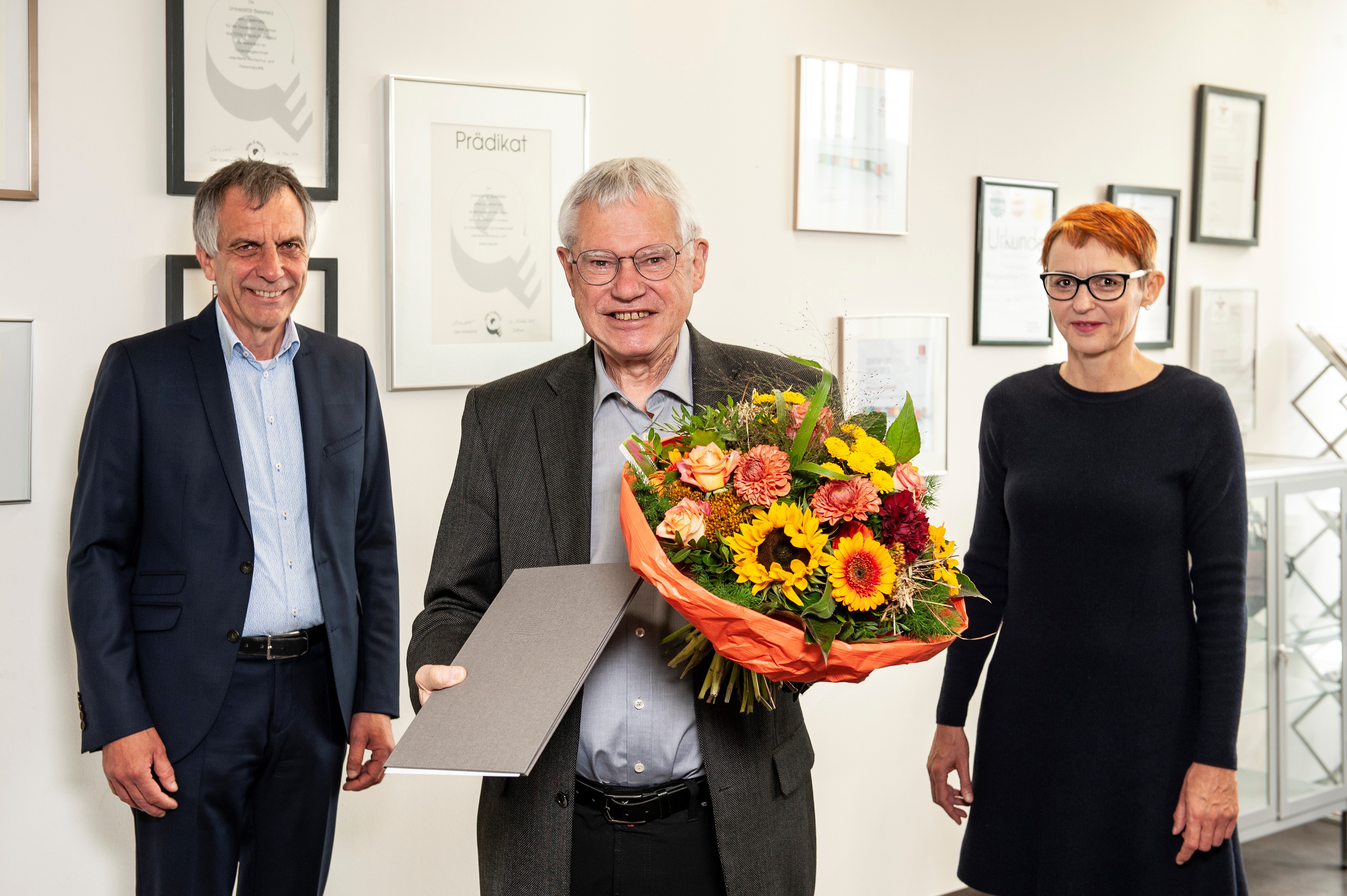 Rektor Prof. Dr. Gerhard Sagerer und die stellvertretende Senatsvorsitzende Dr. Beate Lingnau überreichten die Urkunde zur Ehrensenatorwürde an Prof. Dr. Alfred Pühler. Foto: Universität Bielefeld/J. Dieckmann