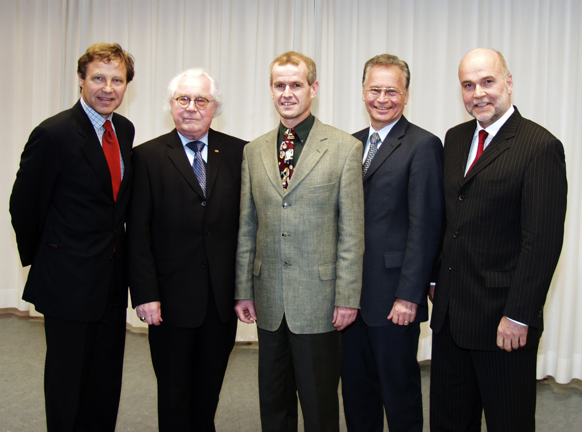 Habilitationpreis der Universitaetsgesellschaft fuer Dr. Hubert Brueckl, Fakultät fuer Physik. Das Foto zeigt (v.l.): Kanzler Hans-Juergen Simm, Prof. Helmut Steiner, Dr. Hubert Brueckl, Ortwin Goldbeck und Rektor Dieter Timmermann.