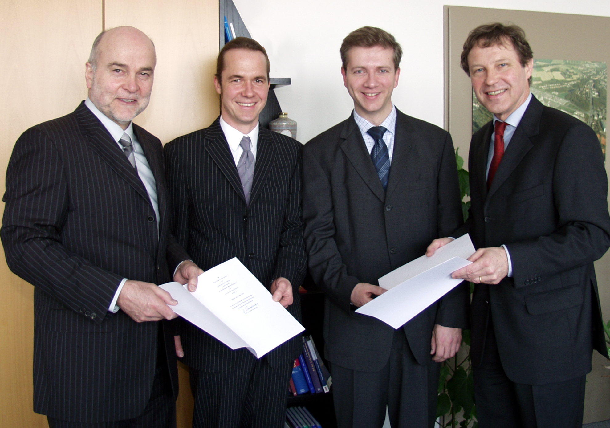 Die ersten Professoren mit der neuen W-3-Besoldung wurden an der Universität Bielefeld vereidigt. Das Foto zeigt v.l. Rektor Dieter Timmermann, die neuen Professoren Ruben Zimmermann und Wolfgang Greiner sowie Kanzler Hans-Jürgen Simm.