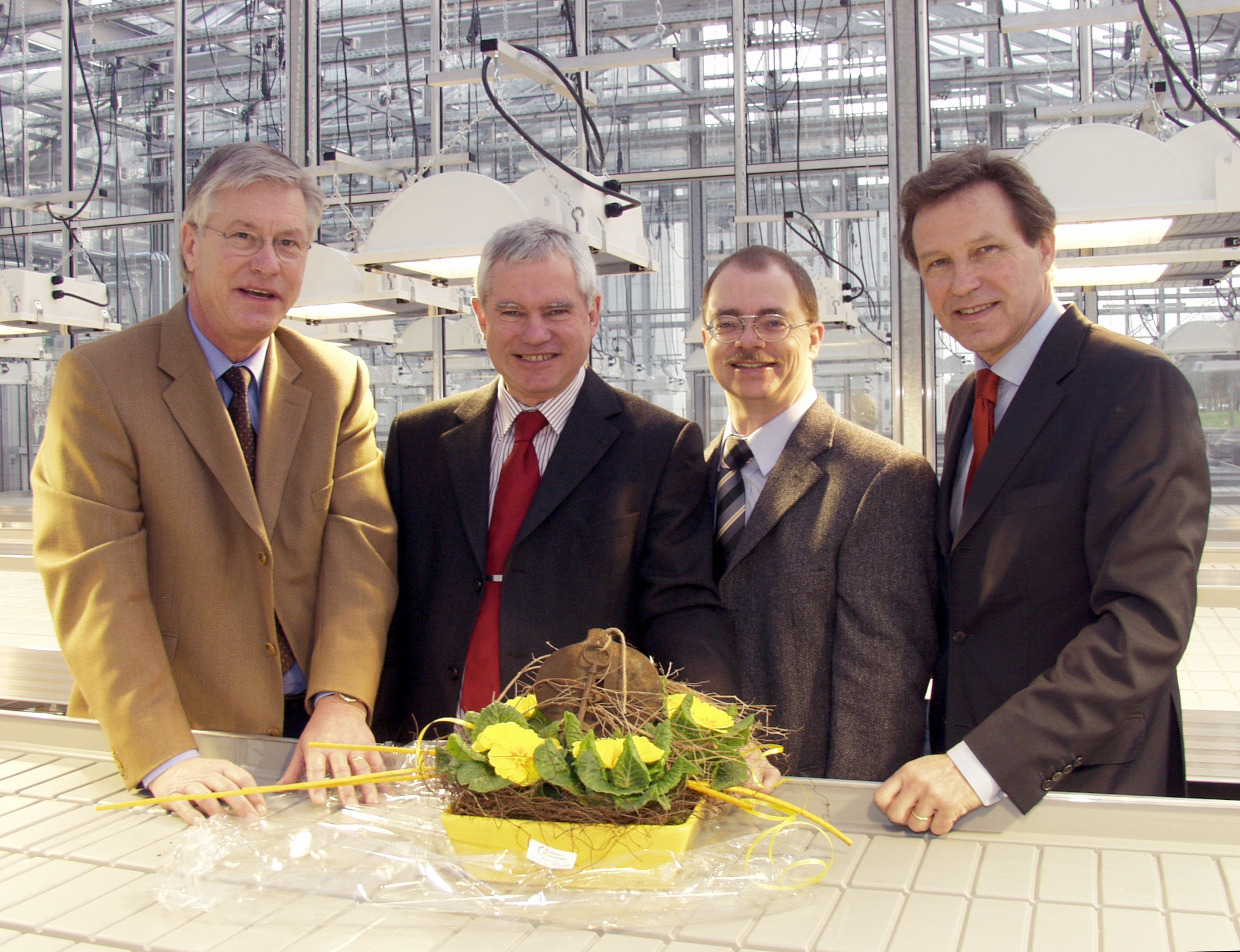Buz 219/2005 - Symbolische Schlüsselblumen zur Übergabe des neuen Gewächshauses. Das Foto zeigt von links Helmut Diederichs, Alfred Pühler, Bernd Weisshaar und Kanzler Hans-Jürgen Simm.