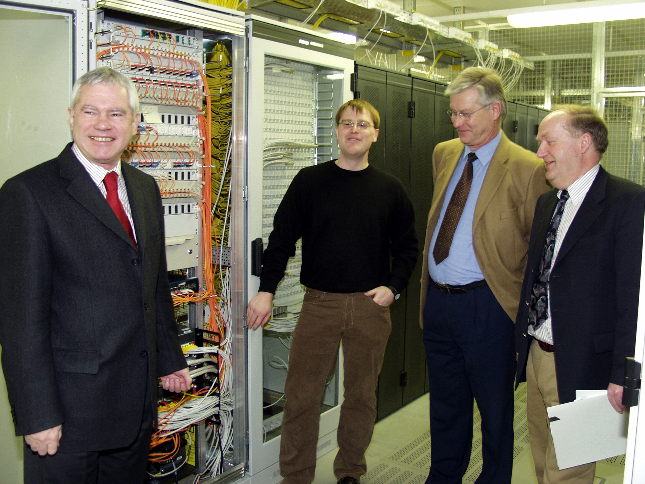 Buz 219/2005 - CeBiTec, Umbau des Maschinensaals des Hochschulrechenzentrums .Das Foto zeigt (v.l.): CeBiTec-Sprecher Alfred Pühler, Folker Meyer (Leiter der Bionformatic Facility), Helmut Diederichs (BLB NRW) und Bernd Nienaber (HRZ).
