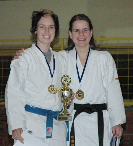 Buz 218/2004 - Sowohl in den Einzelwettbewerben als auch im Team konnten Annika Kläs (links im Bild) und Silvia Hagen von der Universität Bielefeld bei den Deutschen Karate-Hochschulmeisterschaften im Oktober in Erfurt den Titel für sich gewinnen.