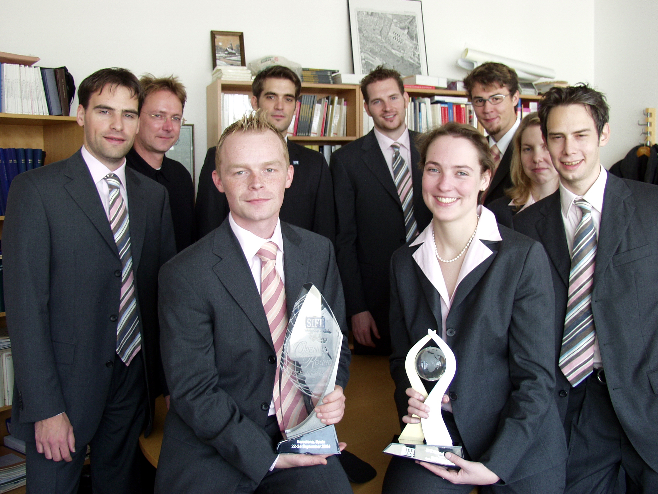 Bild: Buz 218/2004 - SIFE World Cup 2004 in Barcelona. Die erfolgreichen Studierenden mit ihrem Betreuer (v.l.): Michael RuppelBildnummer: 26331