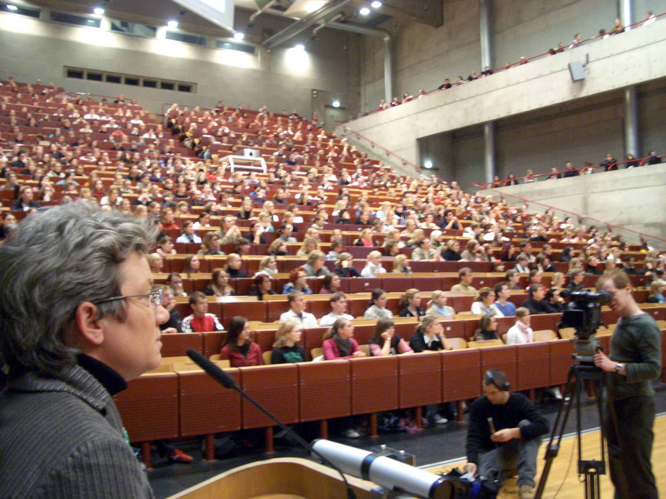 Buz 218/2004 - Knapp 1500 Schülerinnen und Schüler aus der Region konnte Andrea Frank, Referentin des Prorektors für Studium und Lehre, zum Informationstag der Universität Bielefeld im Auditorium maximum begrüßen.