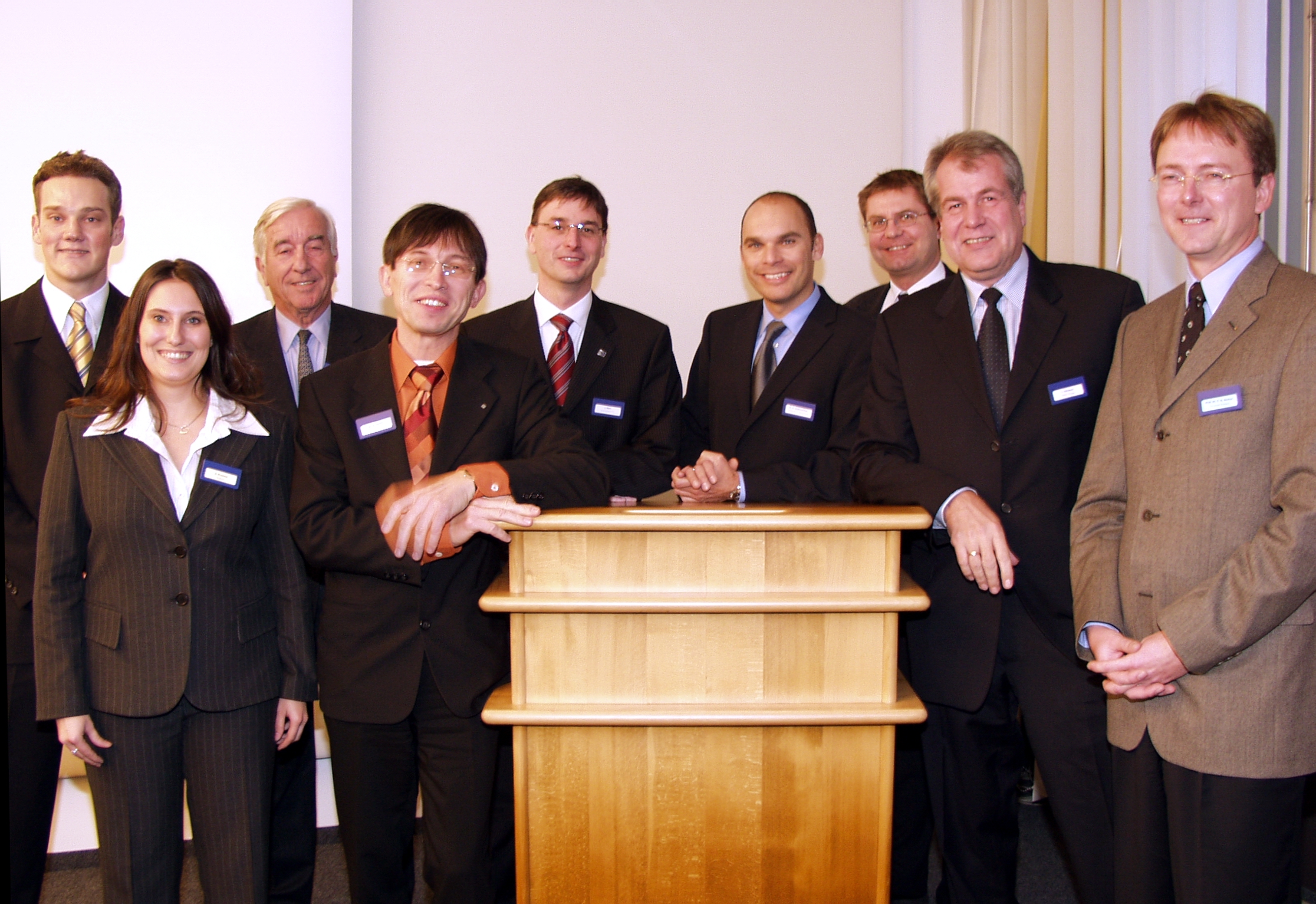 Buz 218/2004 - OWL-Management-Kolloquium in der Universität Bielefeld. Das Bild zeigt (von links nach rechts) Veranstalter und Referenten des Kolloqiums: Christoph Cöllen, Ellena Krumme, Dr. Peter von Möller (MöllerGroup), Dr. Gunther Olesch (PhoenixContact), Joachim Klein (Wirtschaftsjunioren), Gerd Oliver Seidensticker (Seidensticker), Prorektor Norbert Sewald, Ingo Schubert (Hettich) und Fred G. Becker.