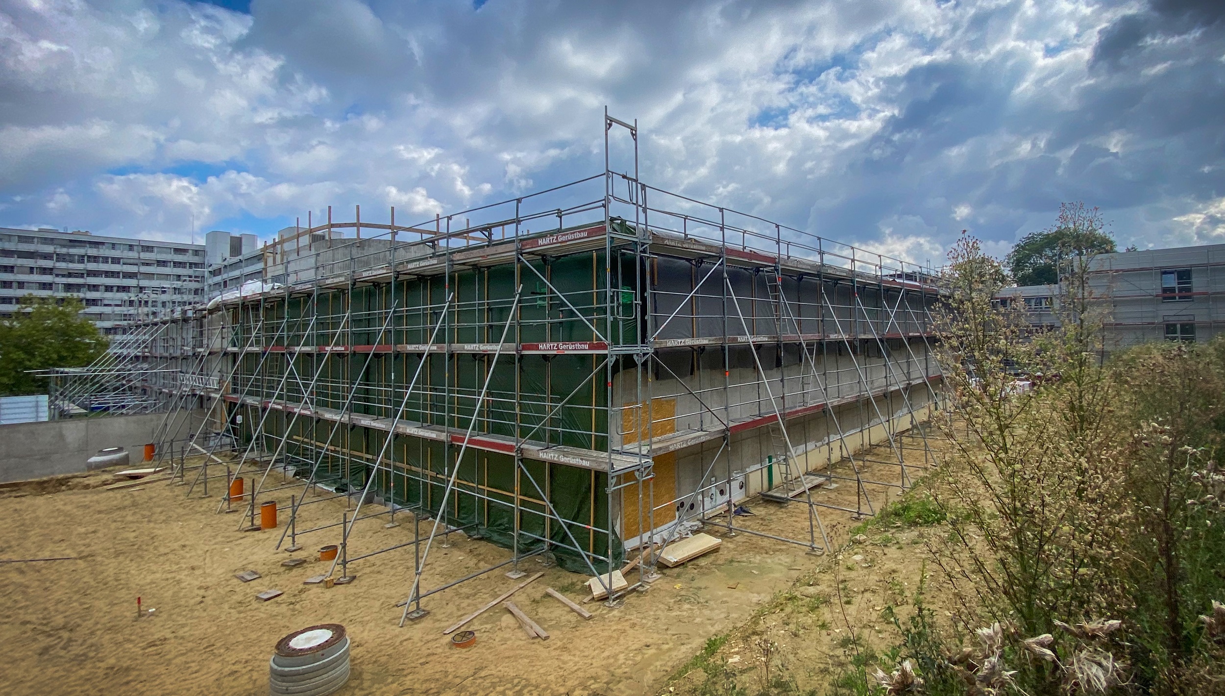 Das neue Hörsaalgebäude Y an der Konsequenz mit Blick auf das Universitätshauptgebäude. Die Montage der finalen Fassade wird für Oktober erwartet.