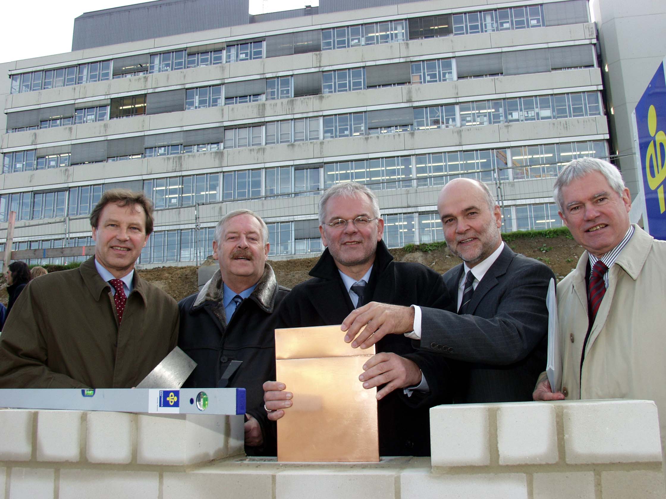 Grundsteinlegung des Laborgebäudes der Universität Bielefeld mit (v.l.): Kanzler Hans-Jürgen Simm, Bürgermeister Horst Grube, Dr. Uwe Günther, Geschäftsführer BLB NRW, Rektor Dieter Timmermann und Prof. Dr. Alfred Pühler.