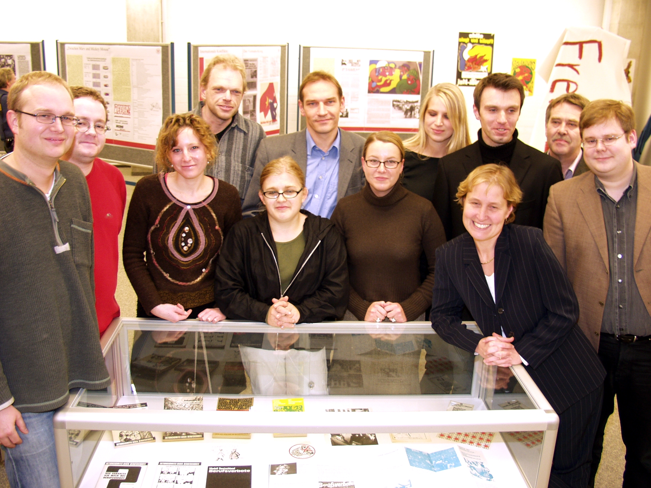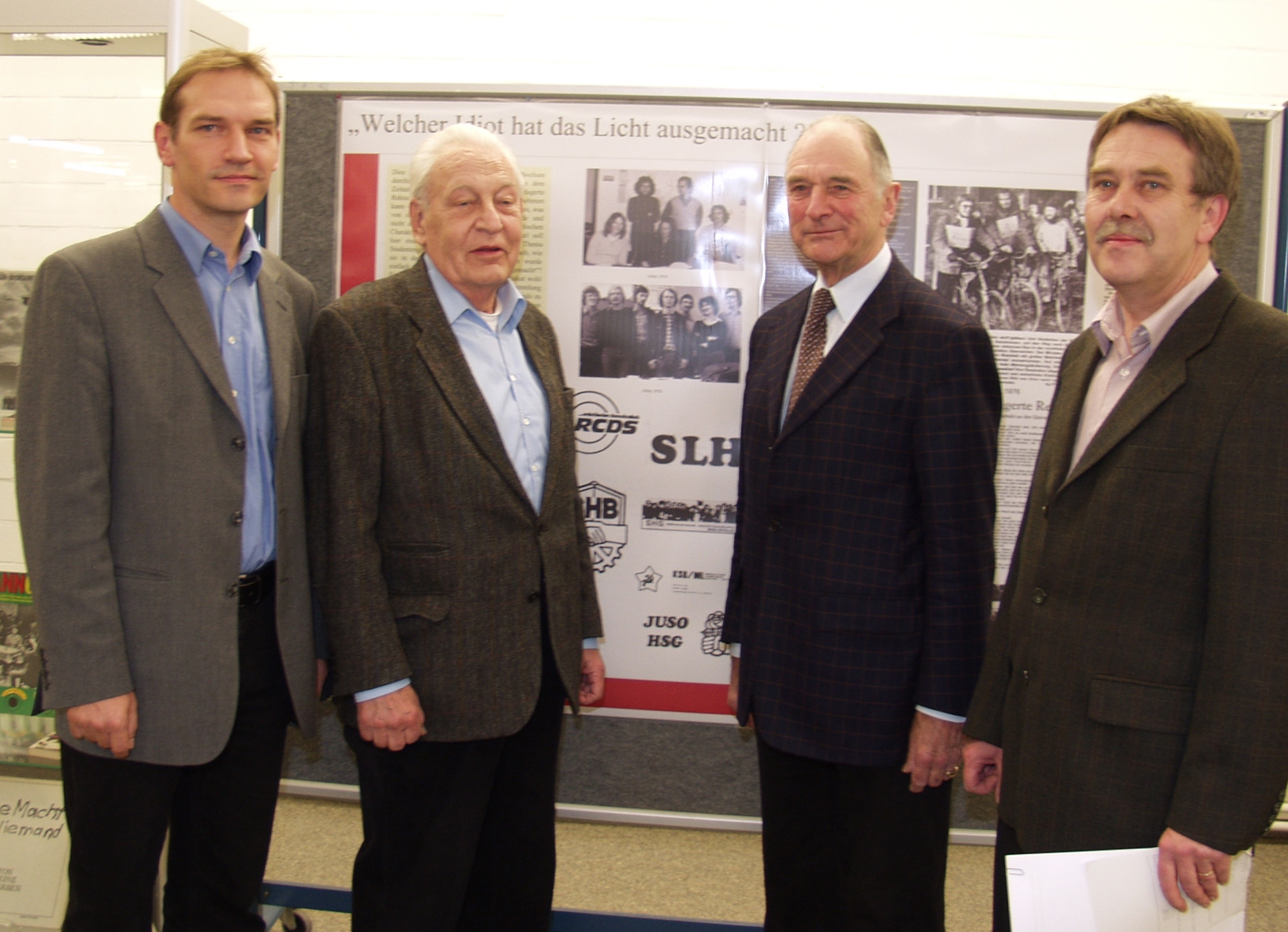 Studierende der Bielefelder Fakultät für Geschichtswissenschaft, Philosophie und Theologie haben sich mit der Geschichte ihrer Universität in den 70er Jahren auseinandergesetzt. Unter fachdidaktischen und berufspraktischen Aspekten erarbeiteten sie unter Anleitung von Dr. Johannes Altenberend (rechts), Studienrat im Hochschuldienst, und Universitätsarchivar Martin Löning (links) eine Ausstellung unter dem Titel "Zusammenarbeit bei hoher Reizbarkeit". Hier zusammen mit dem ehmaligen Rektor Prof. Dr. Karl Peter Grotemeyer (2.v.l.) und dem ehemaligen Kanzler Eberhard Firnhaber.