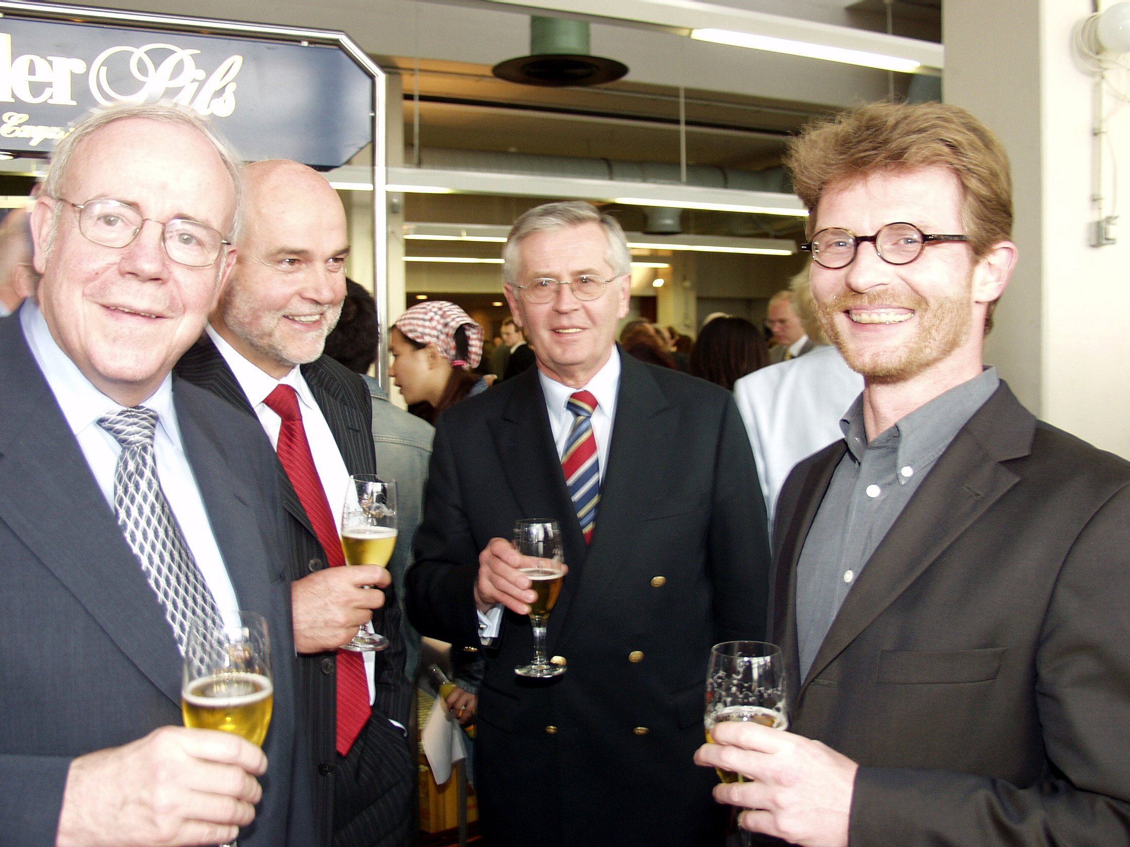 Buz 217/2004 - DFG-Präsident Ernst-Ludwig Winnacker, Rektor Dieter Timmermann, Oberbürgermeister Eberhard David und Regierungspräsident Andreas Wiebe (von links) gut gelaunt beim informellen Teil des Jahresempfangs.