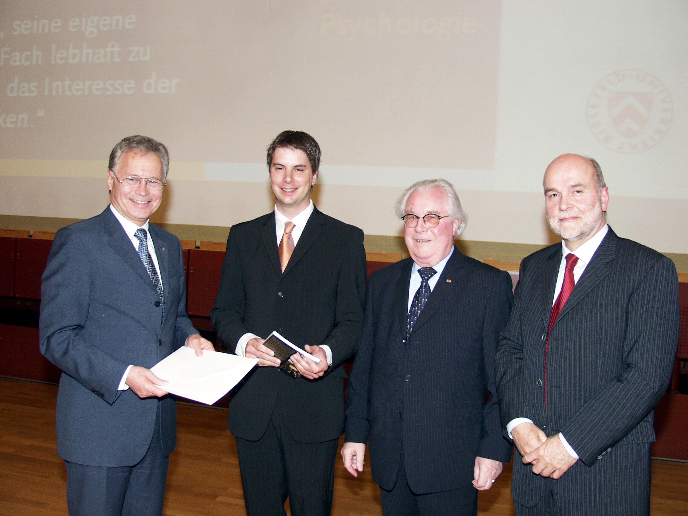 Buz 217/2004 - Jahresempfang 2004 - "Gute Didaktik, interessante Themenwahl, Praxisnähe, Raum für kritische Diskussionen und nicht zuletzt fachliche Kompetenz." Der diesjährige Träger des Karl Peter Grotemeyer-Preises Matthias Brand mit Ortwin Goldbeck (l.) und Helmut Steiner (r.) von der Universitätsgesellschaft.