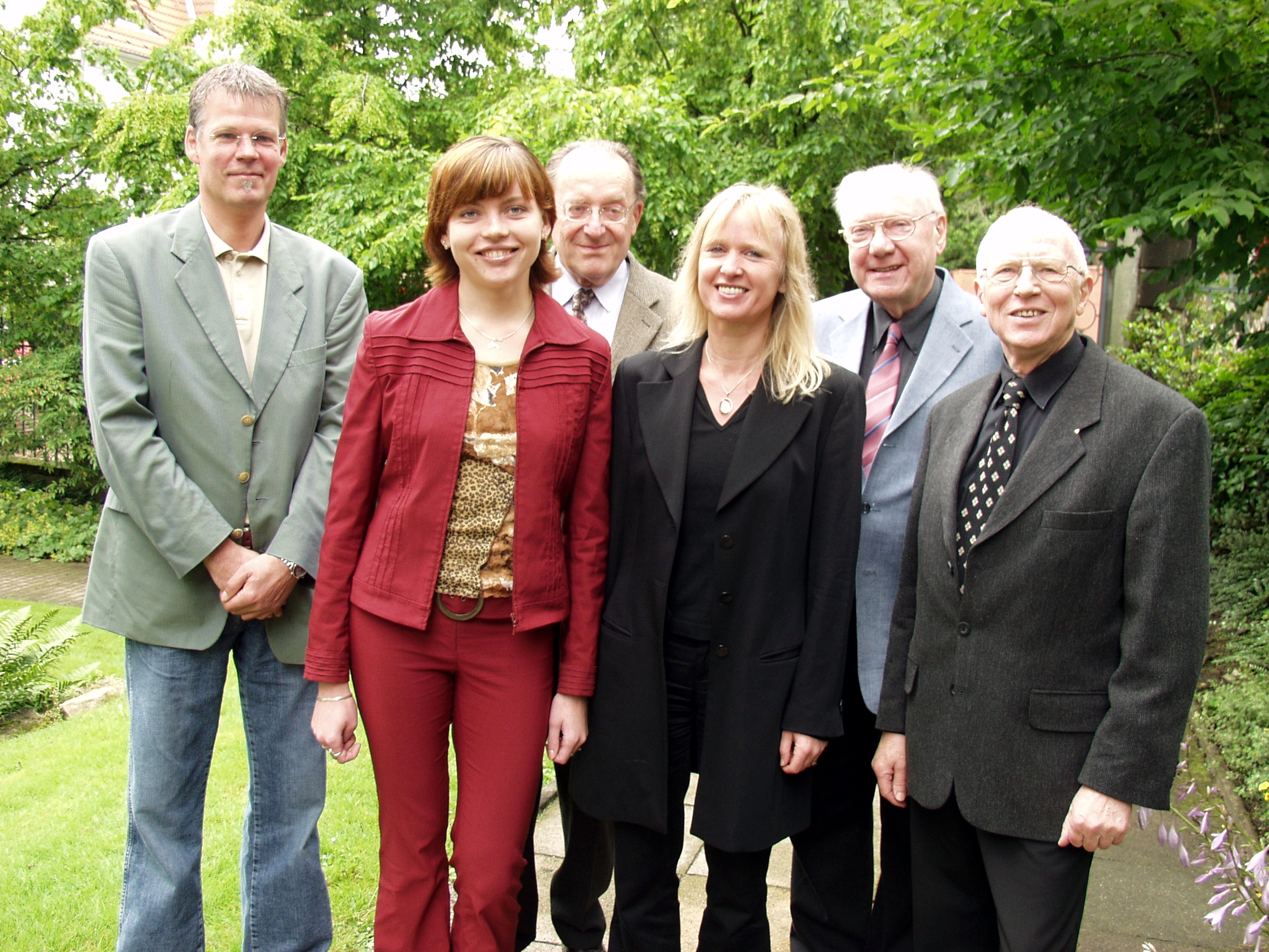 Buz 217/2004 - Stipendien-Übergabe im Lessinghaus. Das Foto zeigt (v.l.): Professor Uwe Sander, Fakultät für Pädagogik, Olga Lakizyuk, Dr. Jürgen Stockmeier (Vorstandsvorsitzender des Freimaurer-Sozialwerks), Dr. Angelika Preisfeld (Mitglied der Vergabekommission), Dr. Bodo Brücher, Fakultät für Pädagogik, und Horst Thermann (Vorstandsmitglied der Bielefelder Freimaurer).