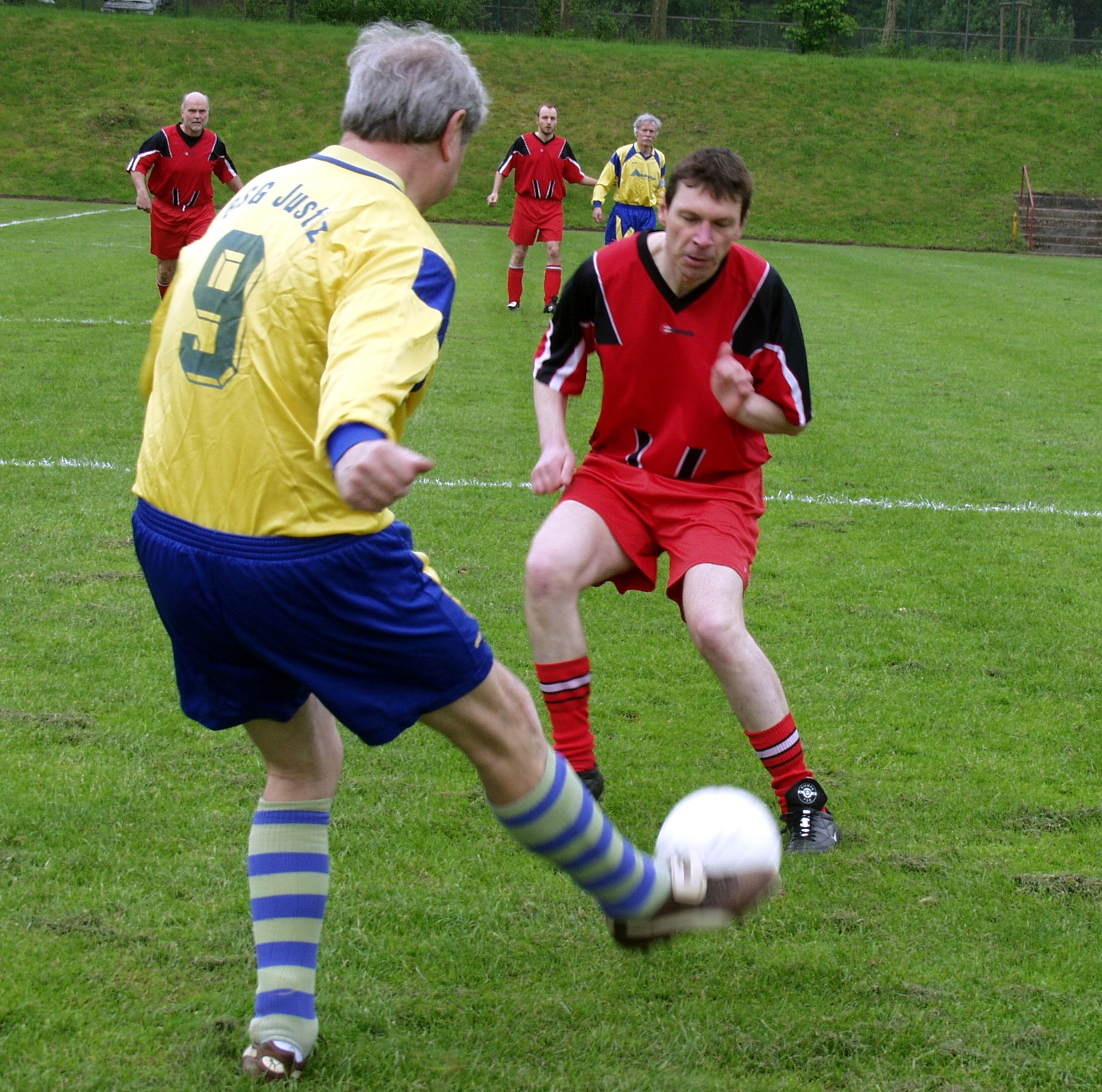 Buz 217/2004 - Alumni-Tag. Die Traditionsmannschaft Bielefelder Juristen landete gegen die aktuelle Auswahl einer Professorenmannschaft der Universität Bielefeld mit 7:2 Toren einen perfekten (ein wenig zu deutlichen) Sieg.