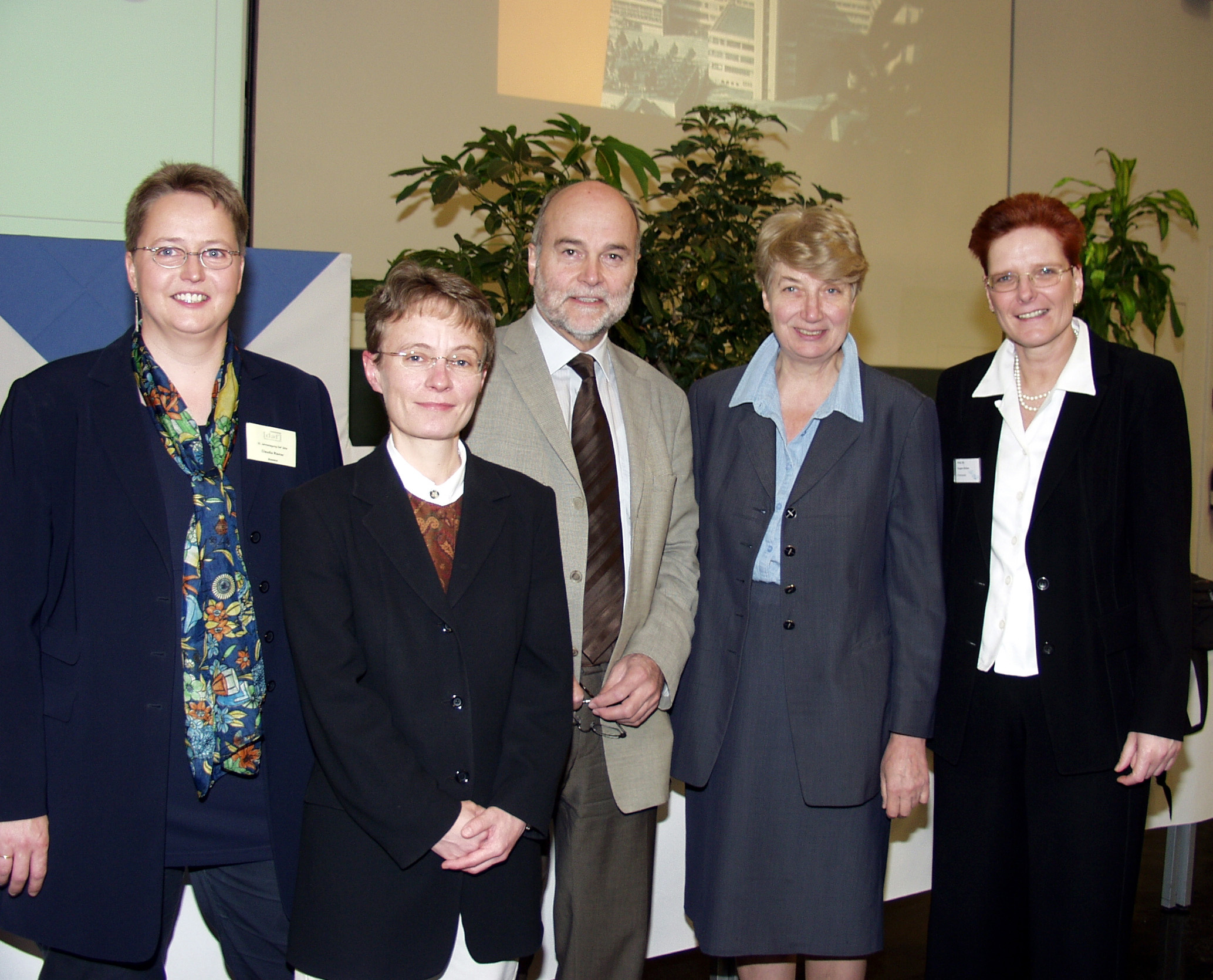 Buz 217/2004 - Eröffneten die 32. Jahrestagung Deutsch als Fremdsprache (von links): Claudia Riemer vom Fach Deutsch als Fremdsprache, Dekanin Lore Benz, Rektor Dieter Timmermann, Barbara John und Hiltraud Casper-Hehne, Vorsitzende des Fachverbandes Deutsch als Fremdsprache.
