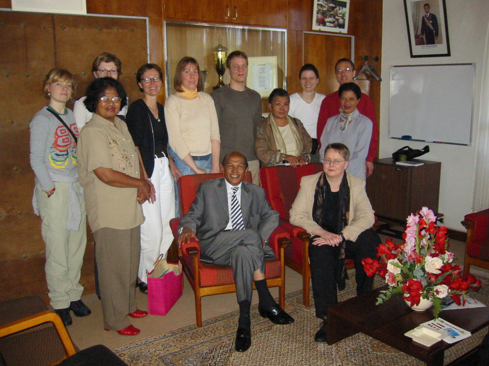 Buz 217/2004 - Empfang durch den Präsidenten der Universität Antananarivo: Präsident Pascal Rakotobe, Claudia Riemer; dahinter (von links): Anke Nürnberger, Beby Soa Raminosoa, Sandra Bomholdt, Sylvia Brandt, Joy-Sarah Ohntrup, Felix Warneke, Liliane Ramarosoa, Julia Richter, Lutz Köster, Rolande Ramasomanana. Foto: lukö.