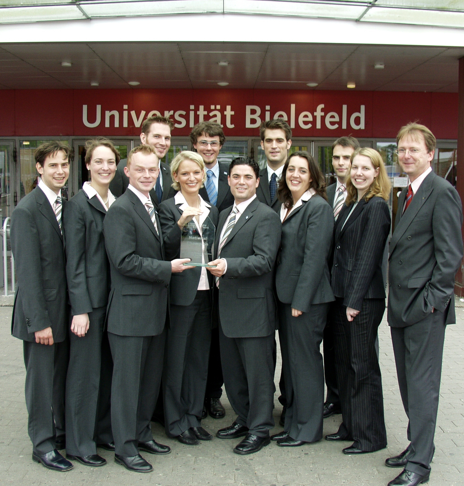 Buz 217/2004 - Bielefelder Wirtschafts-Studenten sind National Champions. Das Foto zeigt (von links): John Wegener, Sabine Schmidt, Georg Greifelt, Gunther Kracke, Janine Ketteler, Horst Dringenberg, Süleyman Erekdi, Axel Krausen, Kaja Otto, Michael Ruppel, Natascha Henseler und Fred G. Becker.
