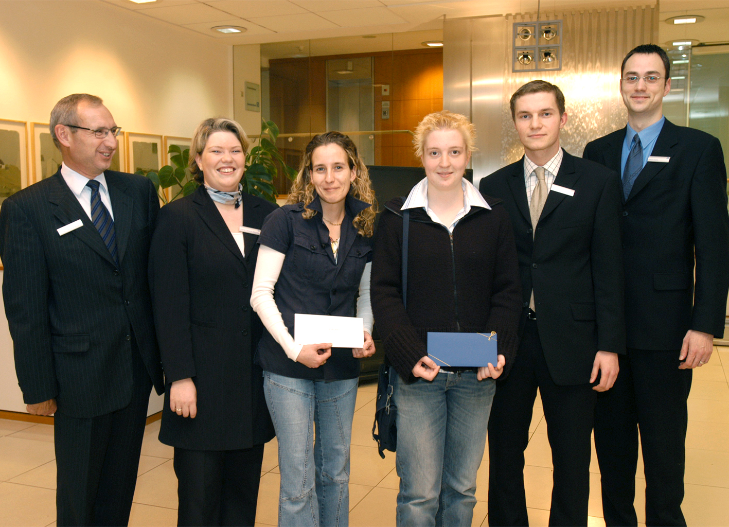 Buz 217/2004 - Uni-Gewinnspiel der Deutschen Bank. Das Foto zeigt (v.l.): Dr. Hans-Reinhard Michel, Chantal Wehmeier (Deutsche Bank), Zsanett Nowak (1. Preis), Sarah Niemeier (2. Preis), Tomas Siergiejewicz und Sascha Gerke (Deutsche Bank).