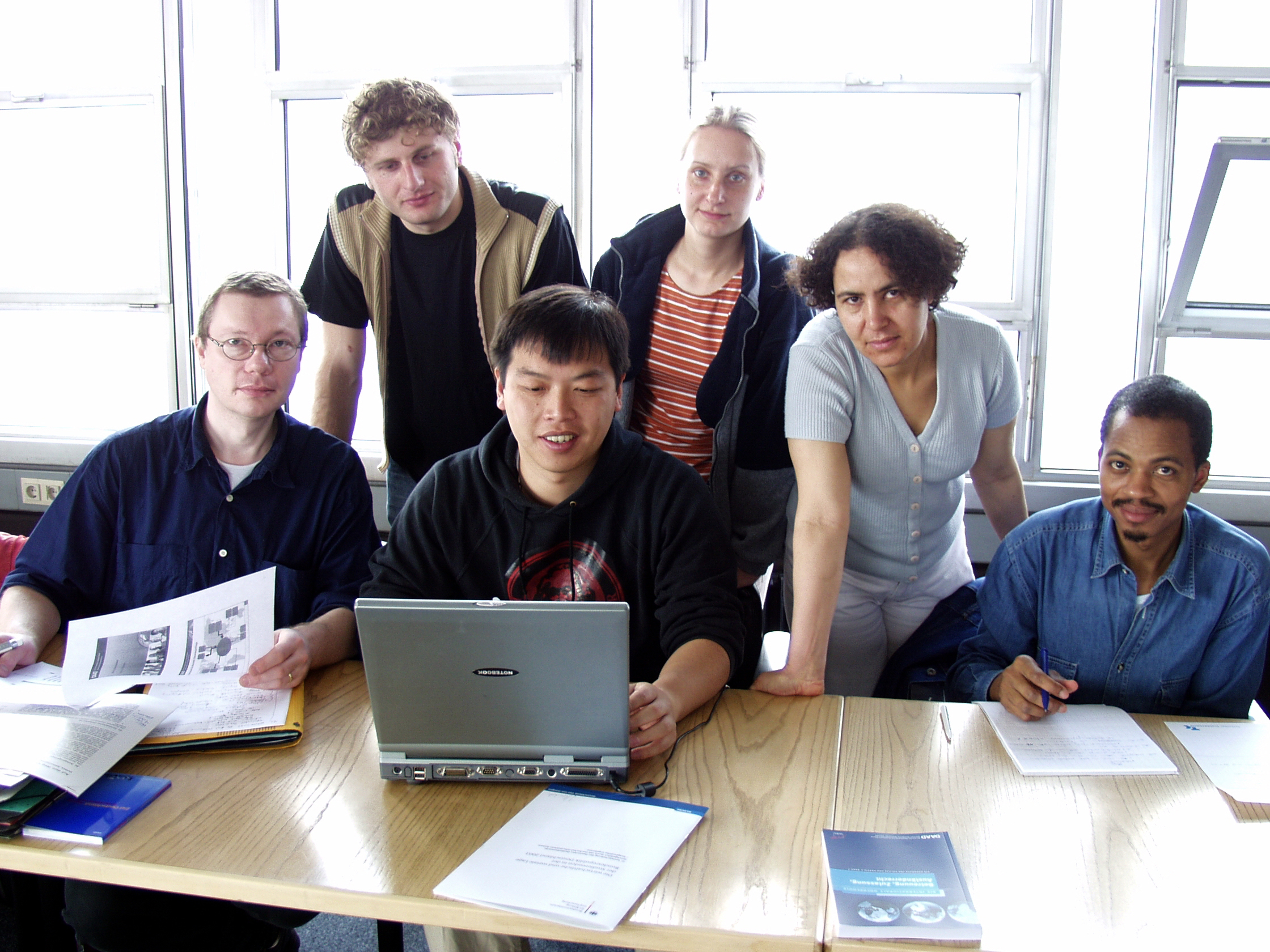 Buz 217/2004 - Treffen der Bundesvereinigung der ausländischen Studierenden. Das Foto zeigt (v.l.): Johannes Glembek, BAS-Geschäftführer (Universität Trier), Amiran Gabunia, BAS-Vorstandsmitglied und Sprecher des Internationalen Studierenden-Rates der Universität Bielefeld, Woei-Hau Luo, BAS-Vorstandsmitglied (Universität Trier), Katarina Müller, Ausländerreferentin der Universität Köln, Fatiha vom Ausländerreferat der Fachhochschule Bielefeld, und Roufaou Oumarou, BAS-Vorstandsmitglied (RTWH Aachen).