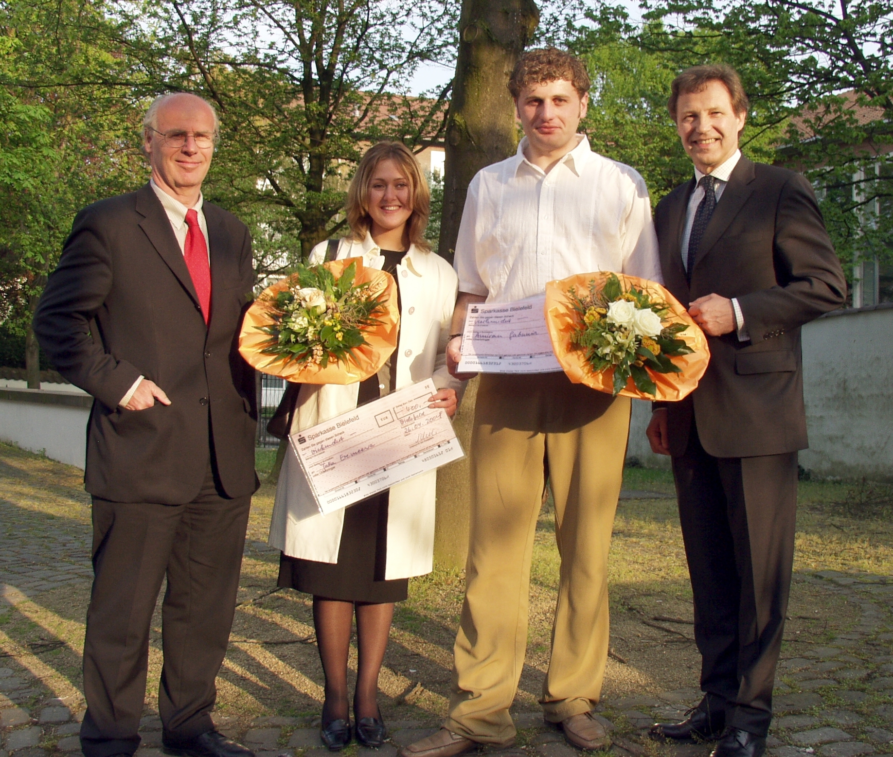 Preise für hervorragende ausländische Studierende, vergeben durch den Verein zur Förderung ausländischer Studierender in Bielefeld e.V. Das Foto zeigt (v.l.): IHK-Präsident Herbert Sommer, Julia Eremeeva, Amiran Gabunia und Kanzler Hans-Jürgen Simm.