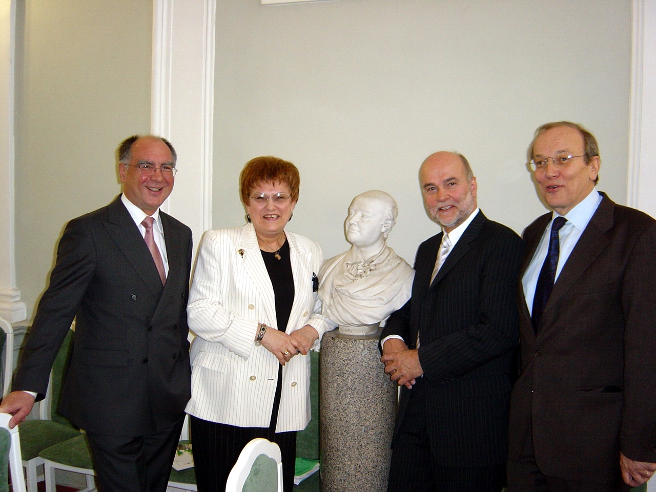 Das weltweit fünfzehnte Zentrum für Deutschland- und Europastudien (ZDES) ist am 26. April im "Petersaal" der Universität St. Petersburg von DAAD-Generalsekretär Dr. Christian Bode (rechts), dem Leiter der Abteilung Kultur und Bildung des Auswärtigen Amtes, Ministerialdirektor Wilfried Grolig (links), und den Rektoren der beteiligten Partneruniversitäten, Professorin Ludmilla Werbitskaja (Universität St. Petersburg) und Professor Dieter Timmermann (Universität Bielefeld), eröffnet worden