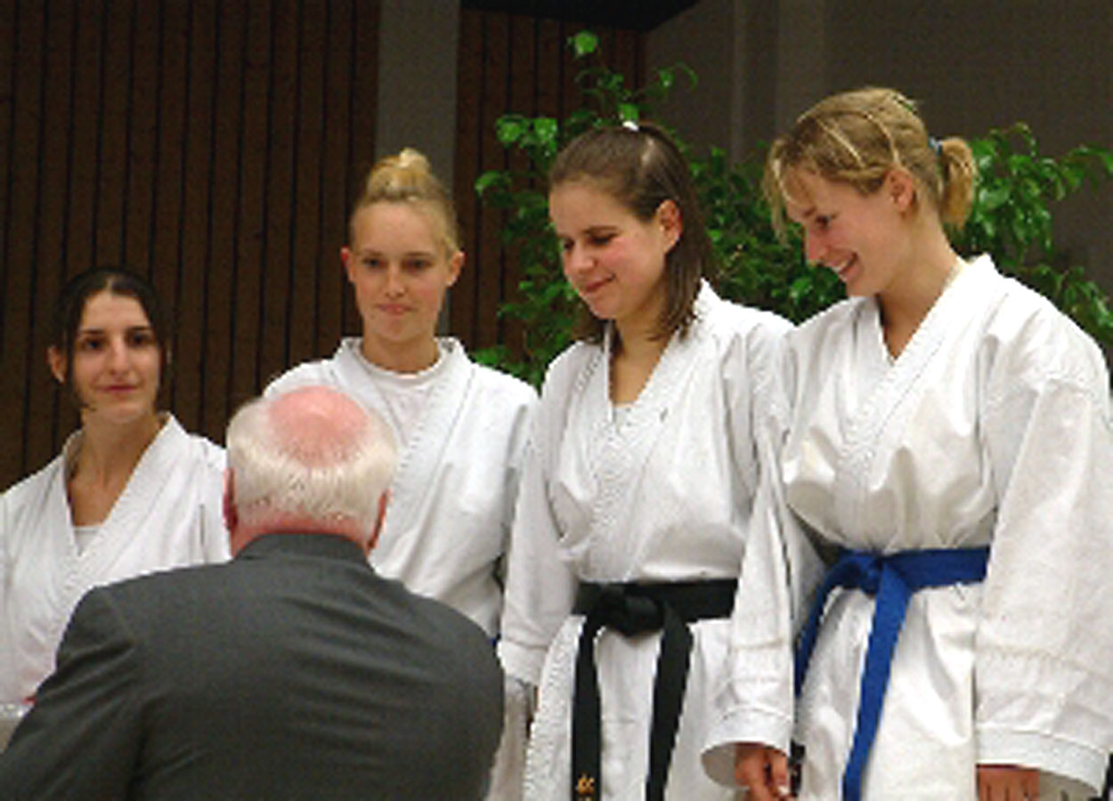 Buz 215/2003: Das Foto zeigt das Bielefelder Karate-Team Kristin Herold, Silvia Hagen und Anakin Kläs (von rechts) bei der Siegerehrung.