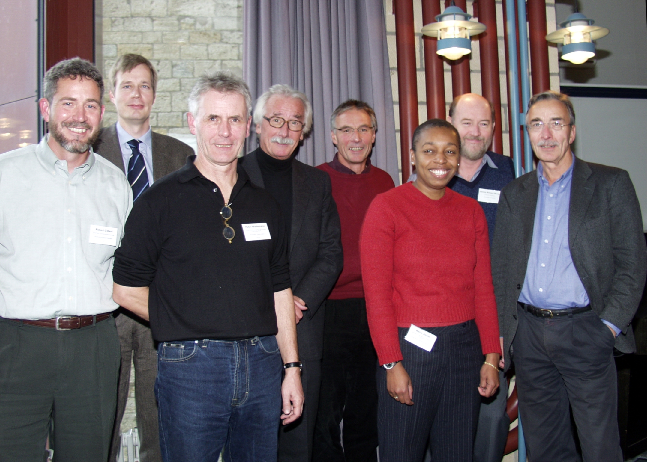 Buz 215/2003: Symposium "Problems and Strategies of Applied Science" des Instituts für Wissenschafts- und Technikforschung der Universität Bielefeld (IWT). Das Foto zeigt die Referenten und Veranstalter (v.l.) Robert G. Best, Felix Thiele, Peter Wiedemann, Günter Küppers, Wolfgang Krohn, Merle Jacob, James Robert Brown, Peter Weingart.