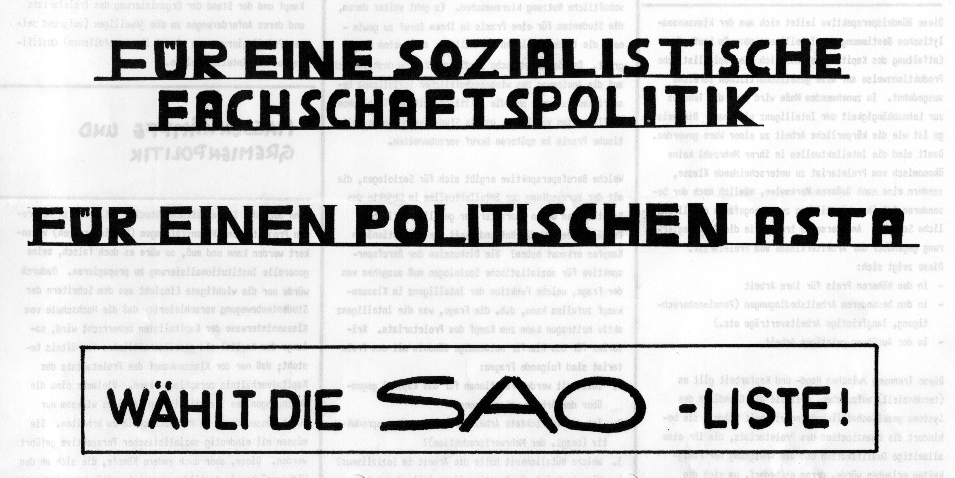 Bild: Buz 215/2003: 1. AStA der Universität Bielefeld. Wahlaufruf der Sozialistischen Aufbauorganisation zu den Fachschaftsleiterkonferenz-Wahlen im Februar 1972.Bildnummer: 19734