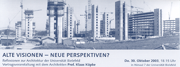 Vortrag "Alte Visisonen - Neue Perspektiven?" Reflexionen zur Architektur der Universität Bielefeld. Vortragsveranstaltung mit dem Architekten Prof. Klaus Köpke. Do 30. Oktober 2003, 18.15 Uhr in Hörsall 7 der Universität Bielefeld