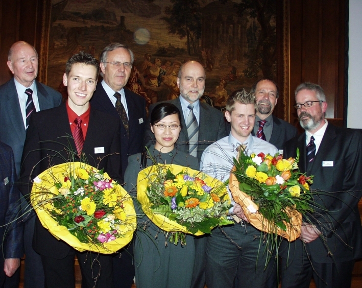 Förderpreis des Industrie- und Handelsclub Ostwestfalen-Lippe. Das Foto zeigt (von links): Erhard Kiezewski (IHC-Geschäftsführer), Henning Trsek, Wolfgang Weber (Rektor der Universität Paderborn), Zhen Wang, Dieter Timmermann (Rektor der Universität Bielefeld), Matthias Meier, Tilmann Fischer (Rektor der FH Lippe und Höxter) und IHC-Präsident Karl Fordemann.