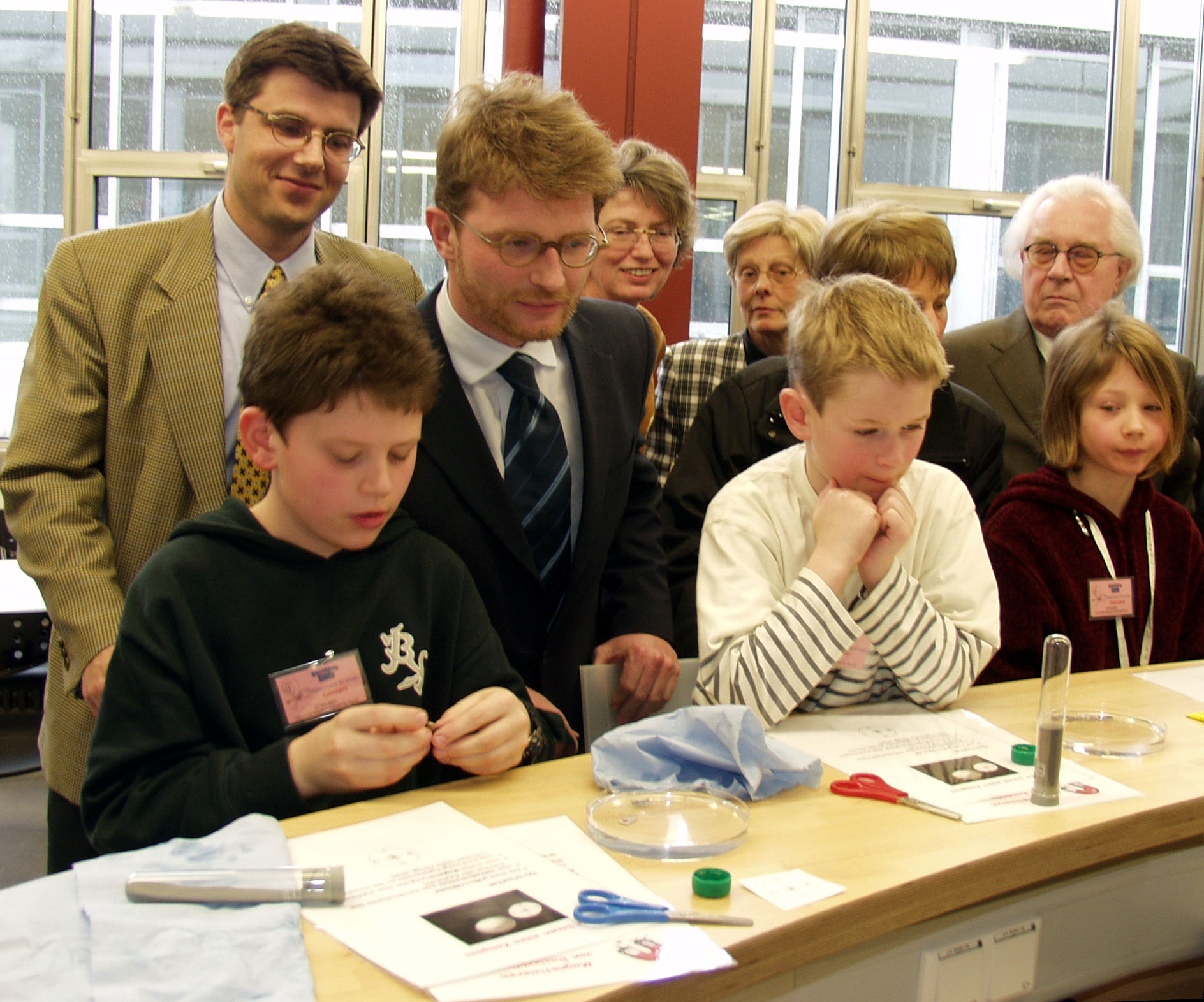 teutolab-Physik, Regierungspräsident Andreas Wiebe (vorne im Bild) und dahinter der Bielefelder Physiker Dario Anselmetti sowie Helmut Steiner (rechts) von der Universitätsgesellschaft verfolgen die experimentierenden Schüler.
