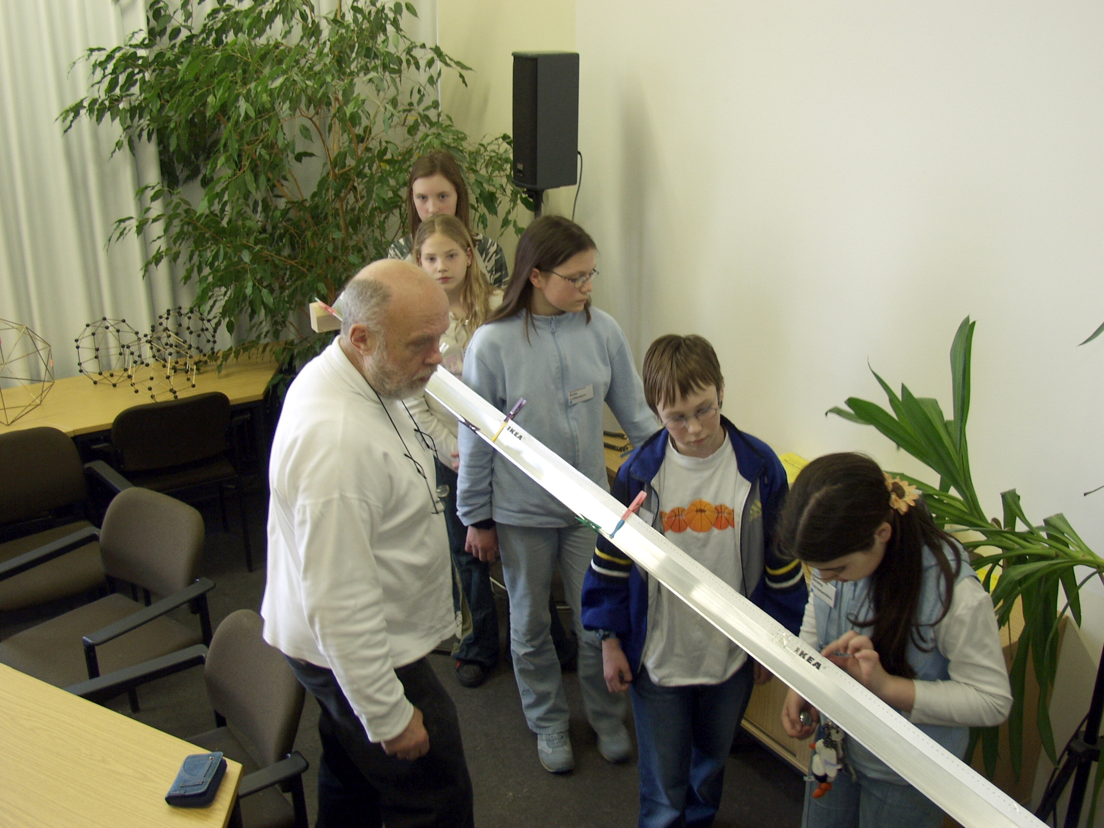 Bild: Schülerinnen und Schüler der Klasse 6a des Bielefelder Helmholtz-Gymnasiums - hier zusammen mit Professor Andreas Dress (l.) - entdecken im teutolab-Mathematik die spannende Welt der Mathematik.Bildnummer: 15603