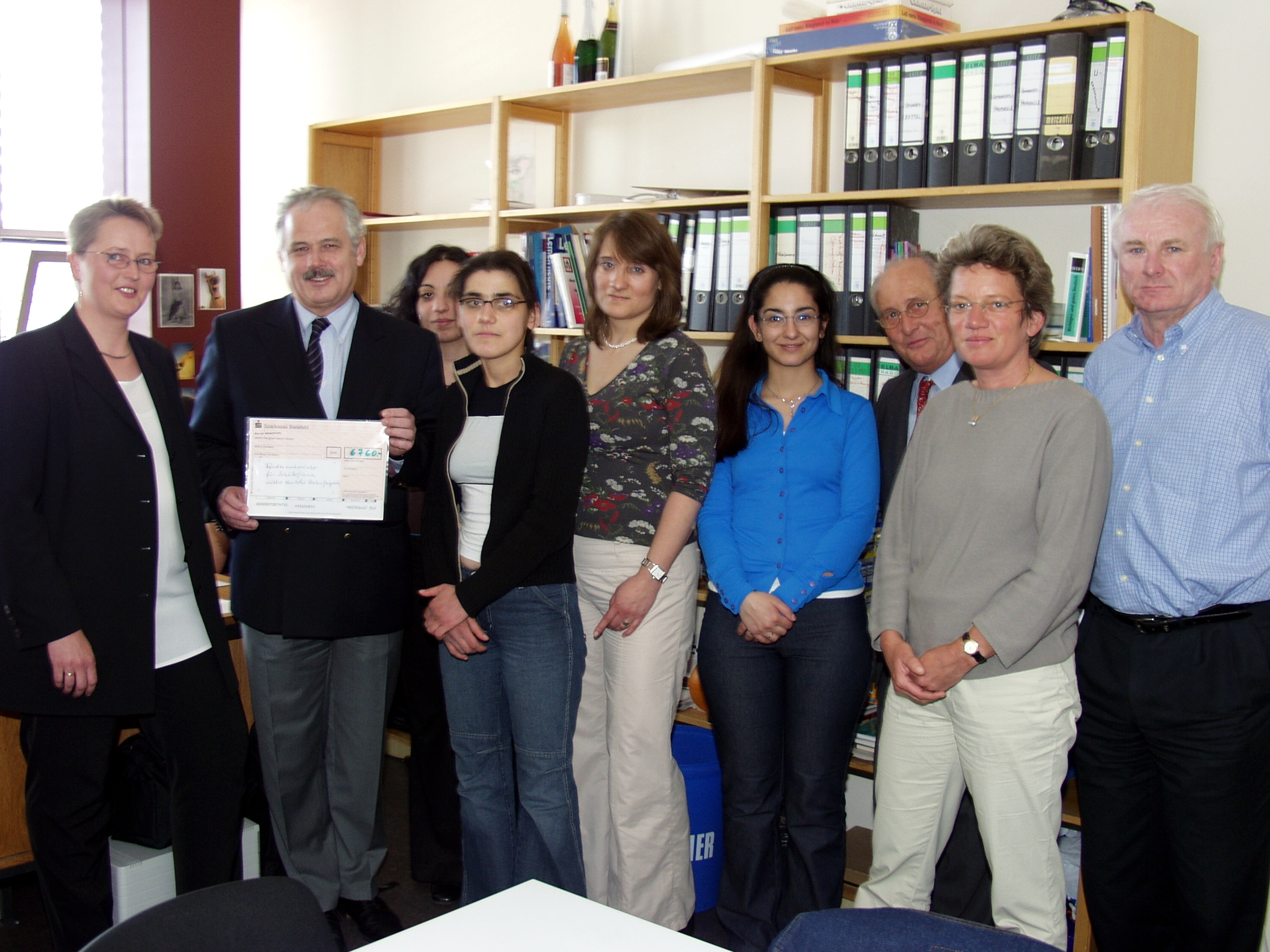 Projekt "Förderunterricht für Schülerinnen und Schüler nicht deutscher Herkunftssprache". Der Präsident des Rotary-Clubs, Prof. Dr. Peter Mariß (2.v.l.), überreicht eine Spende an Projektleiterin Claudia Riemer (l.) und Beatrix Hinrichs (2. v.r.).
