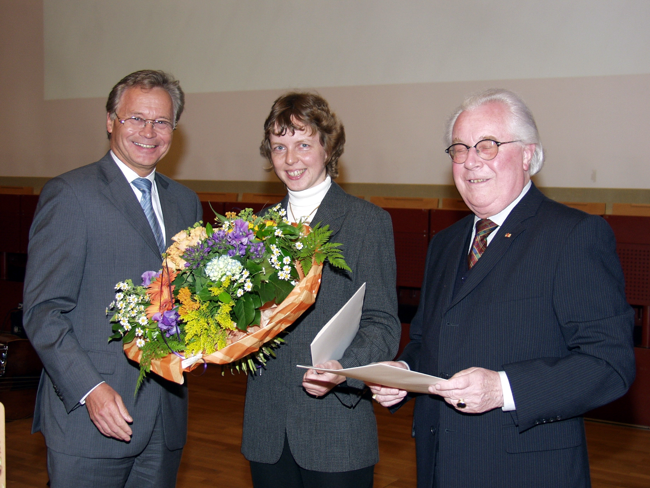 Jahresempfang 2003. Physikprofessorin Friederike Schmid erhält vom Vorsitzenden der Universitätsgesellschaft Ortwin Goldbeck (l.) und Geschäftsführer Helmut Steiner den Karl-Peter-Grotemeyer-Preis für gute Lehre.