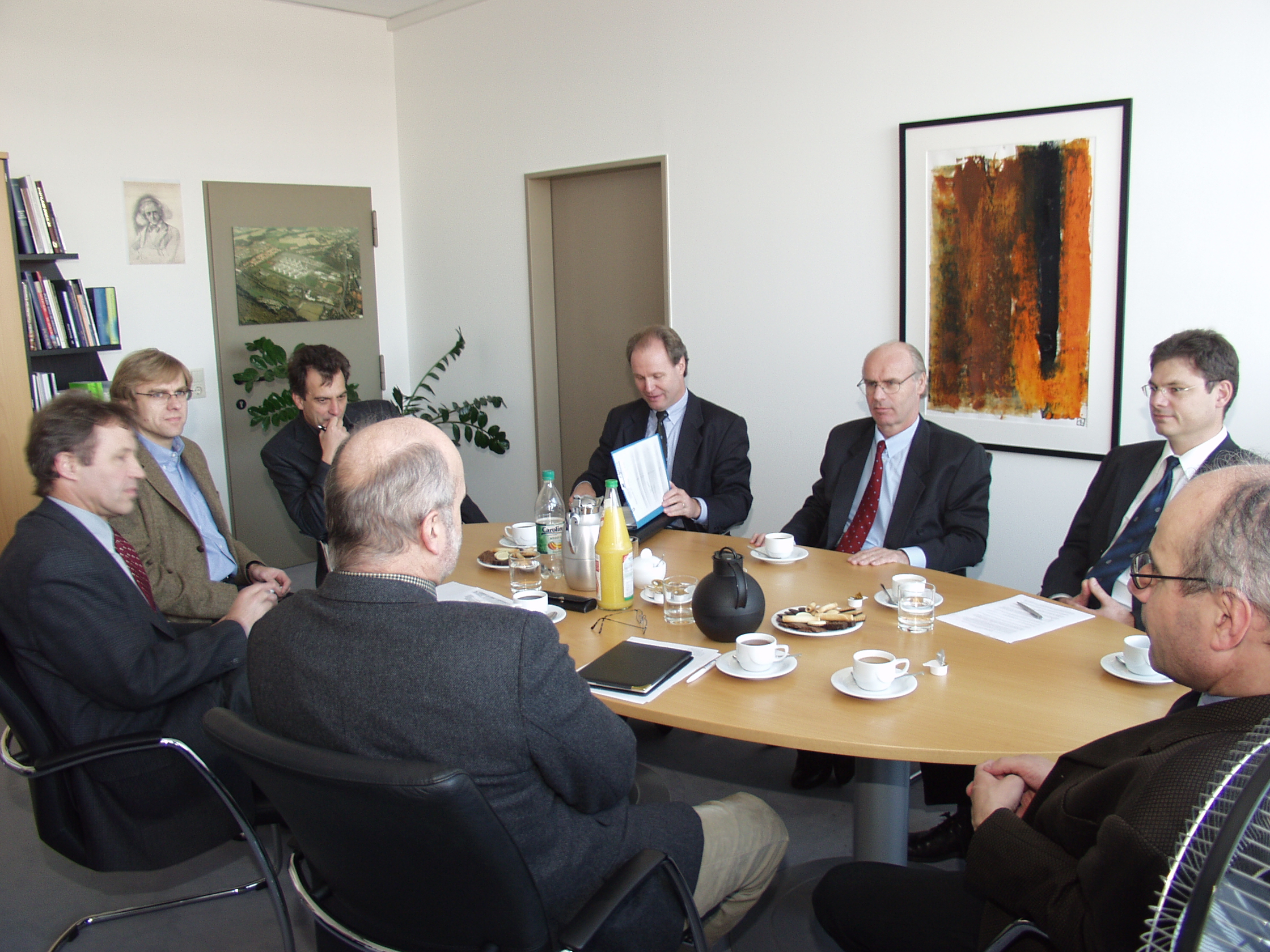 Das Foto zeigt von rechts Prorektor Christoph Gusy, Christoph Vonderheide, Herbert Sommer, Thomas Niehoff, Prorektor Gerhard Sagerer, Dr. Gerd Meier (Referent des Rektors), Kanzler Hans-Jürgen Simm und Rektor Dieter Timmermann.